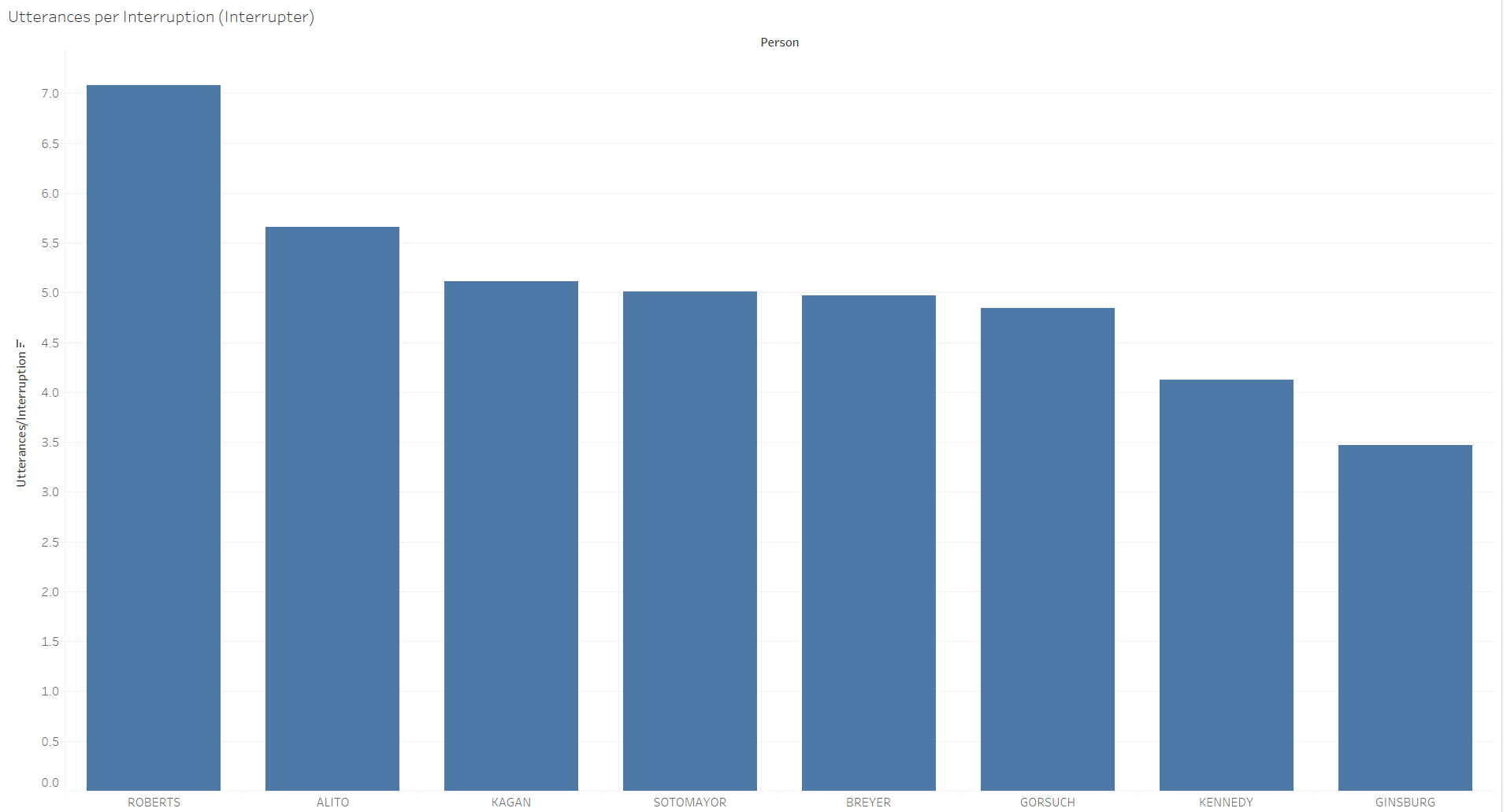 Roberts and Alito were the least frequent interrupters by utterance, followed by Kagan, Sotomayor and Breyer, while Kennedy and Ginsburg were once again the most frequent interrupters.