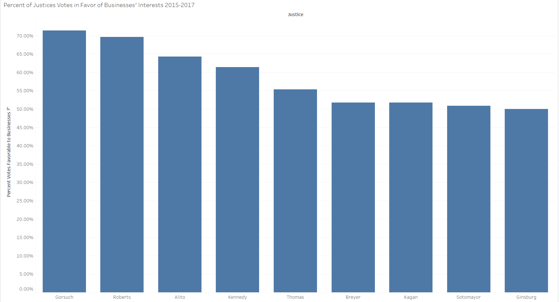 The current Supreme Court is friendly toward big business. How friendly? If the court’s trajectory continues, perhaps as friendly as any court dating back to the Lochner era, when laissez-faire policies permeated the court’s rulings. Prominent scholars, most notably Lee Epstein, William Landes and Richard Posner, have found empirical support for the proposition that the current court is more pro-business than previous iterations. (That study was recently updated through the 2015 term.) This post uses data from the 2015 through 2017 terms to add to this discussion. In particular it seeks to locate the trajectory of the court with the possible addition of Judge Brett Kavanaugh for the October 2018 term. Although the court’s right and left sides found themselves on opposite ends of business rulings during the October 2017 term, we might expect an even stronger pro-business court next term with the addition of another likely predictably pro-business justice in Kavanaugh.