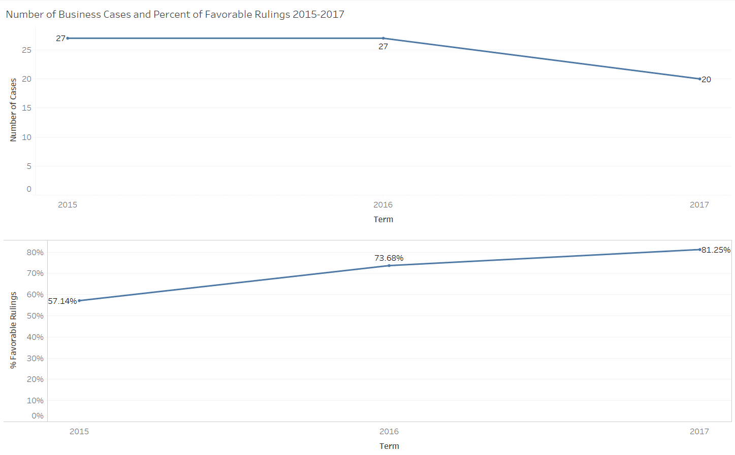 This figure was created by coding all of the court’s orally argued cases from the October 2015 through 2017 terms as focused on a business interest or not and then narrowing the scope to cases that pitted a clear business interest against a contrary interest, thus excluding cases with dueling business interests. Sixty-six cases met the narrowed criteria that underlie the construction of the figure above.