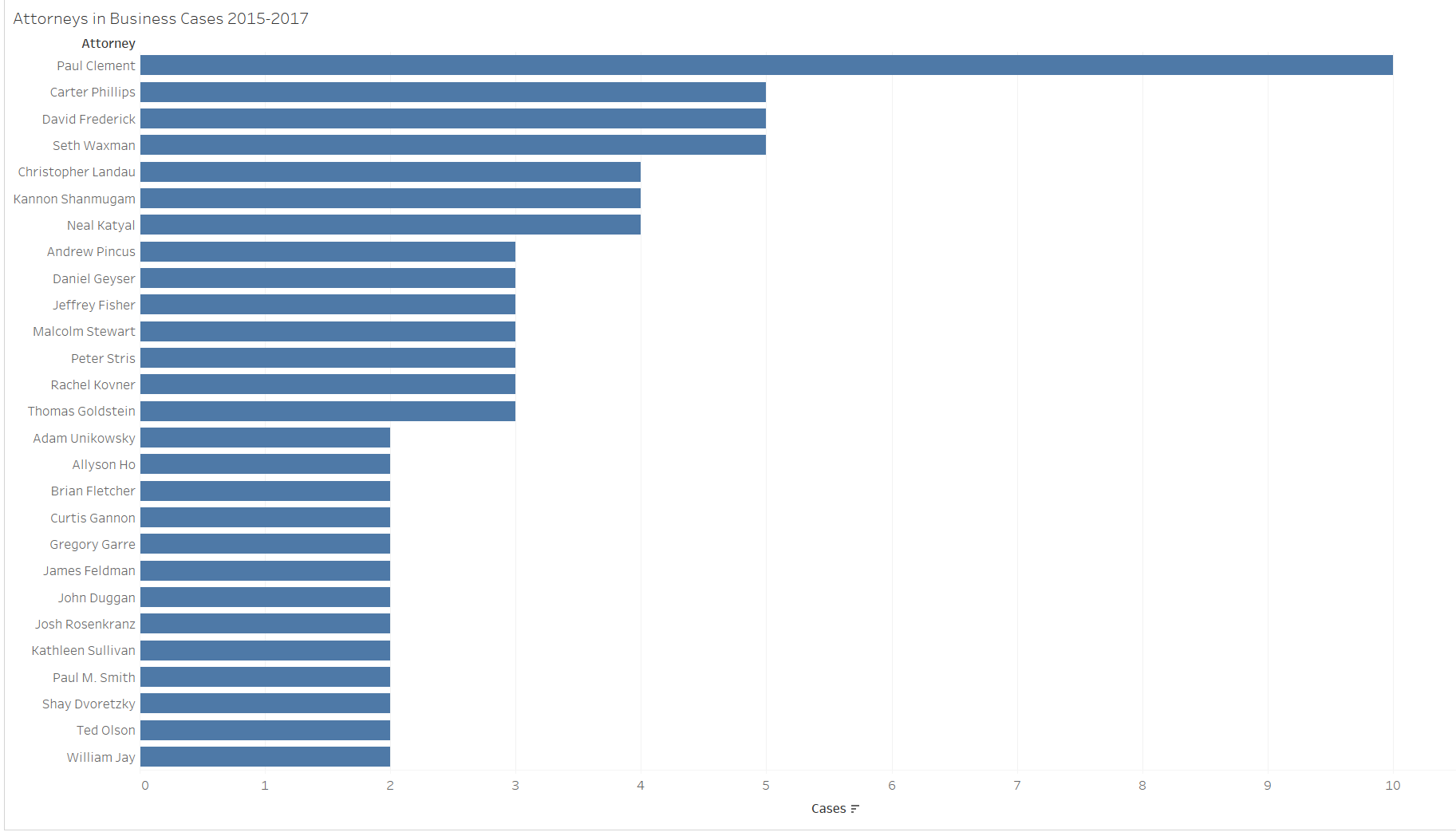 Many of the most notable appellate attorneys now in practice argued several of these cases, with Paul Clement in the lead, followed by fellow veteran Supreme Court attorneys Carter Phillips, David Frederick and Seth Waxman. Although several other big-firm attorneys top this list, the list also includes a handful of attorneys from smaller appellate boutiques, including Peter Stris and Daniel Geyser from the Los Angeles based firm Stris & Maher (Geyser has since started his own boutique, Geyser PC) and Thomas Goldstein, from the D.C.-area firm Goldstein & Russell (who is the publisher of SCOTUSblog).