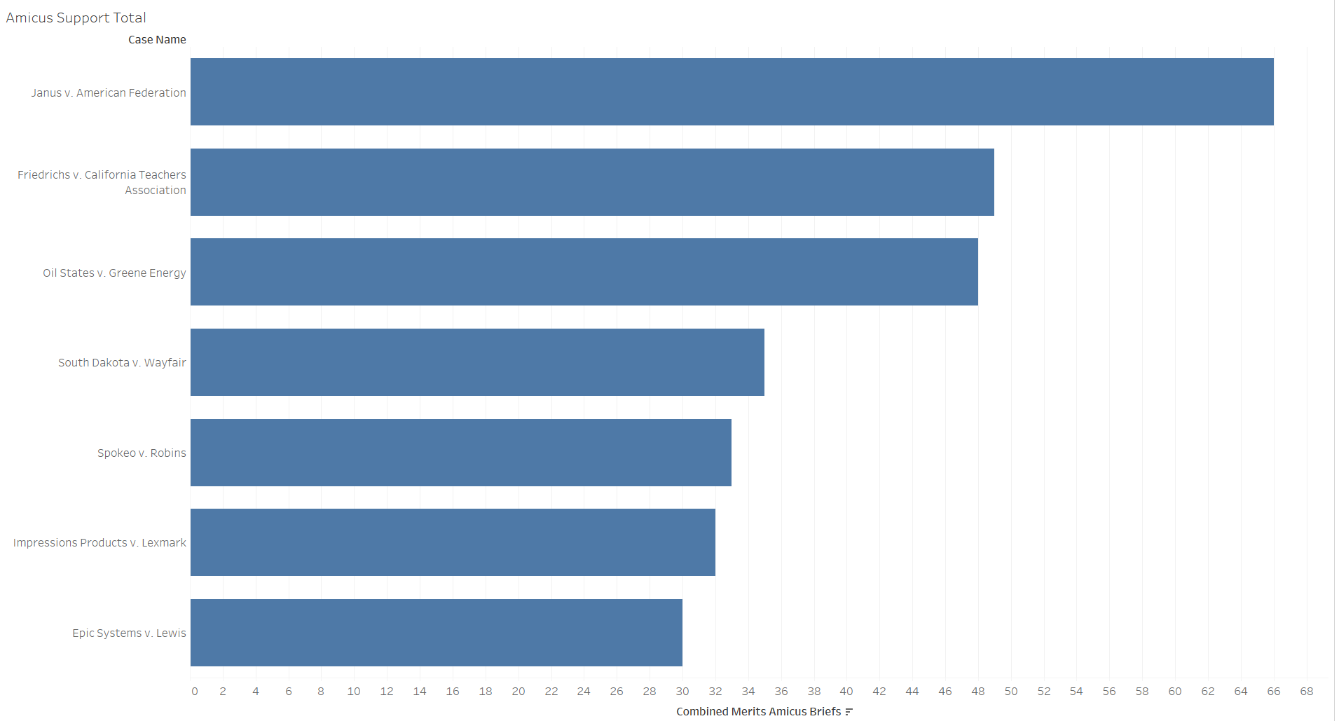 The two cases with the most merits amicus briefs were Friedrichs v. California Teachers Association and Janus v. American Federation of State, County and Municipal Employees , which both involved mandatory union dues. Several patent-related cases, Oil States Energy Services v. Greene’s Energy Group and Impressions Products v. Lexmark International, also made the top of the list, along with two other cases from this past term — Wayfair and Epic Systems Corp. v. Lewis. These cases already make up a large portion of the court’s docket, so we may expect to see an even greater influx of similarly minded petitions as the court moves policy in an even more favorable direction for big businesses. [Disclosure: Goldstein & Russell, P.C., whose attorneys contribute to this blog in various capacities, was among the counsel on amicus briefs in support of the respondents in Janus and in support of the petitioner in Oil States.]