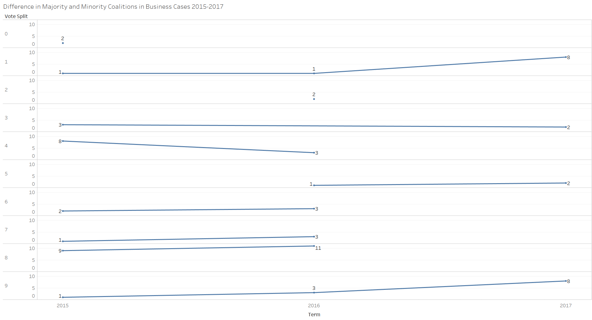 Furthermore, although the court sided with pro-business interests more frequently last term than it has in previous terms, many of these were decided by a narrow margin. The following figure shows the difference in majority and minority votes in this set of decisions for the past three terms (the row labeled “1” is for cases decided by a single vote).