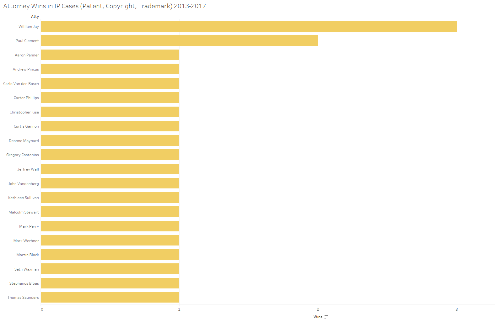 Goodwin Procter’s William Jay won the most such cases since 2013 with three wins, followed by Paul Clement with two. The list of attorneys with one win in this area includes many other prominent Supreme Court attorneys.