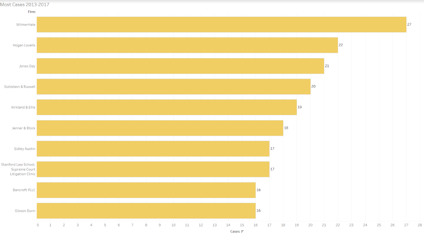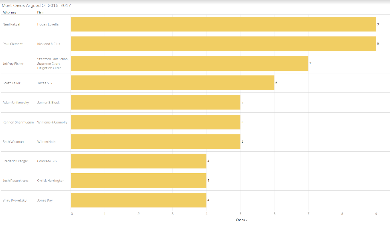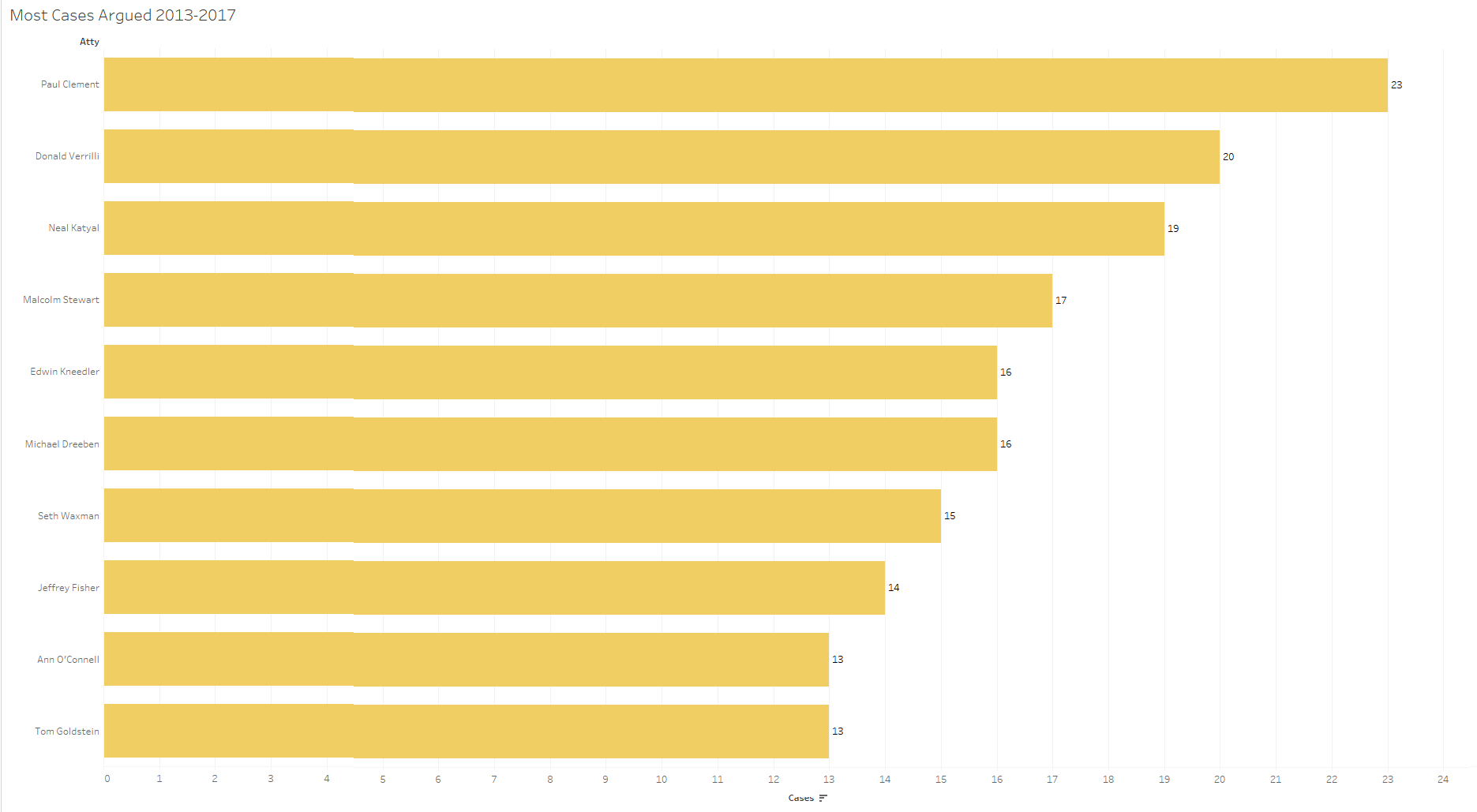 To get the lay of the land, the first chart takes a look at the most active attorneys before the Supreme Court in terms of oral arguments between the 2013 and 2017 terms.