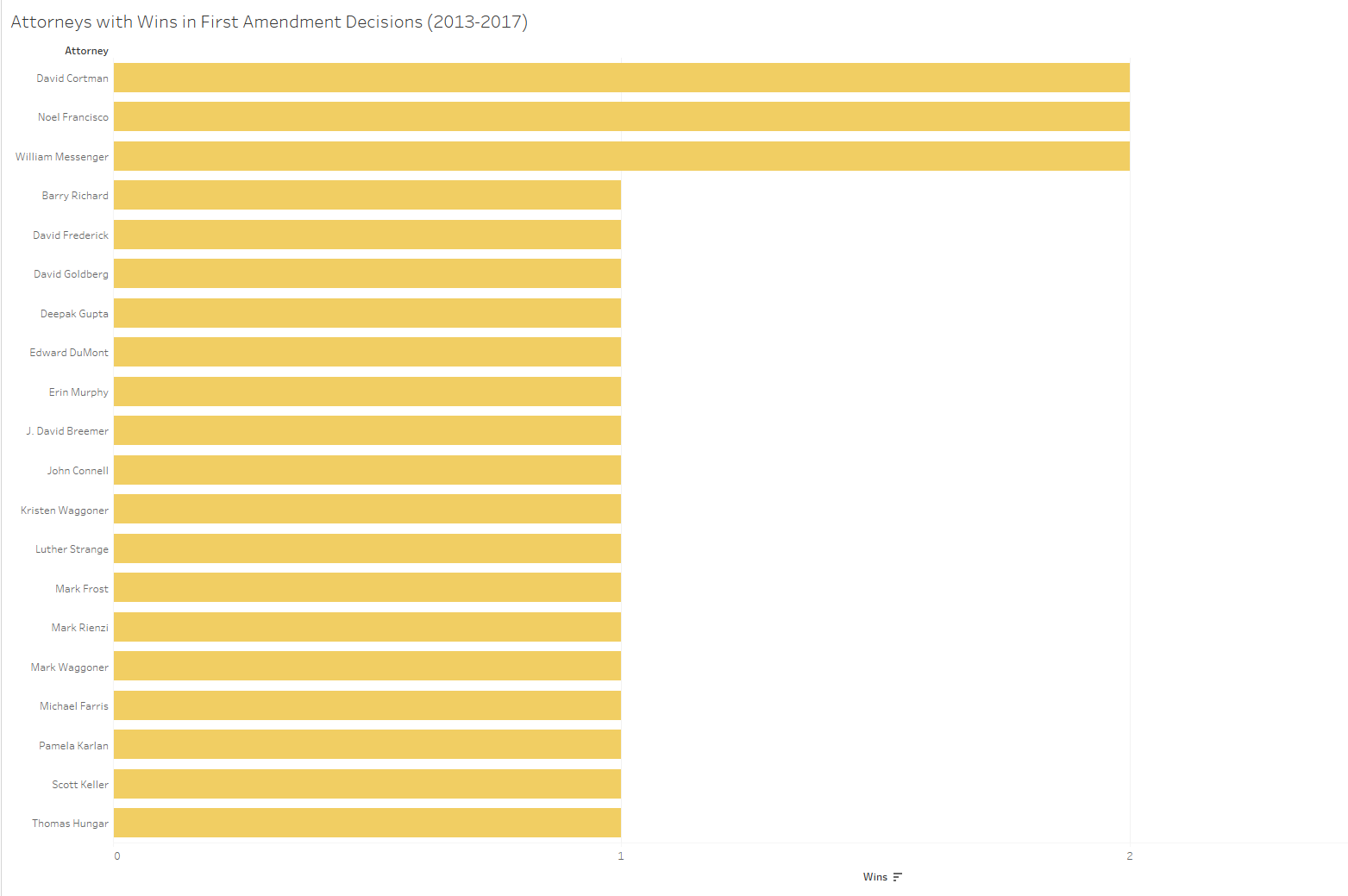 Only three attorneys have multiple wins in this area across this time period. None of these three – David Cortman, Noel Francisco (who argued cases for Jones Day and as the U.S. solicitor general) or William Messenger – was mentioned in previous figures. Many of the other attorneys who won cases in this area specialize in this type of law, while others, like Deepak Gupta, Erin Murphy and David Frederick, among others, are generally well known for their Supreme Court practices.