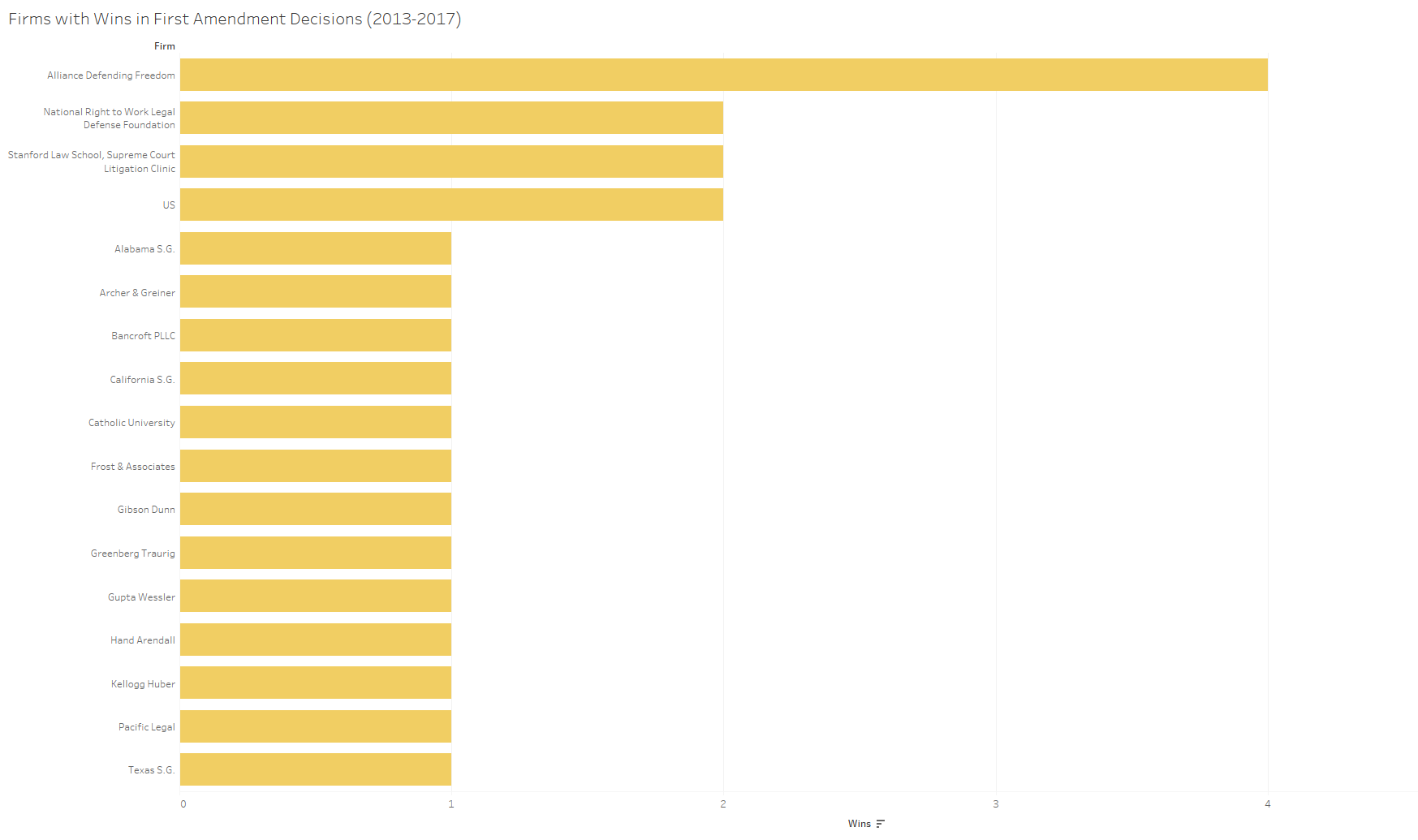 The leader in this area, Alliance Defending Freedom, with four wins, had David Cortman as the lead attorney in two of these cases. Next come OSG, Stanford’s Supreme Court Litigation Clinic and the National Right to Work Legal Defense Foundation (where William Messenger works).