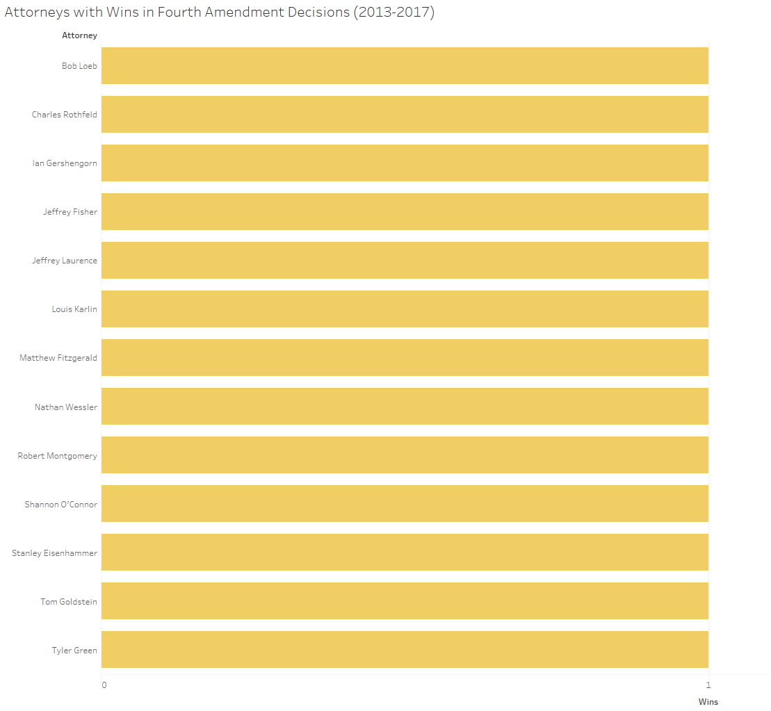 Moving to another area with multiple cases before the Supreme Court each term, the next two figures look at attorneys and firms that tried Fourth Amendment cases between the 2013 and 2017 terms.