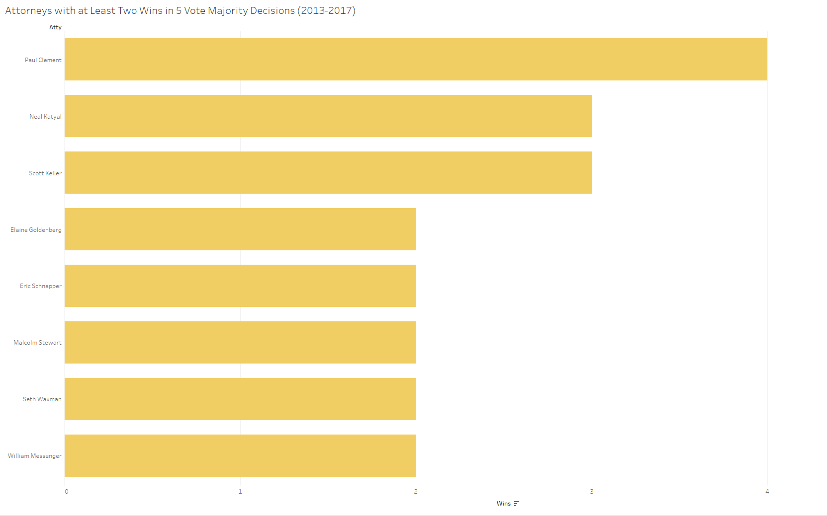 One way to separate out attorneys is to look at those who have been successful in cases that came down to close votes. This is also a way to gauge some of the most proficient Supreme Court attorneys. The following figure tracks attorneys who won two or more cases decided by a five-vote majority between the 2013 and 2017 terms.