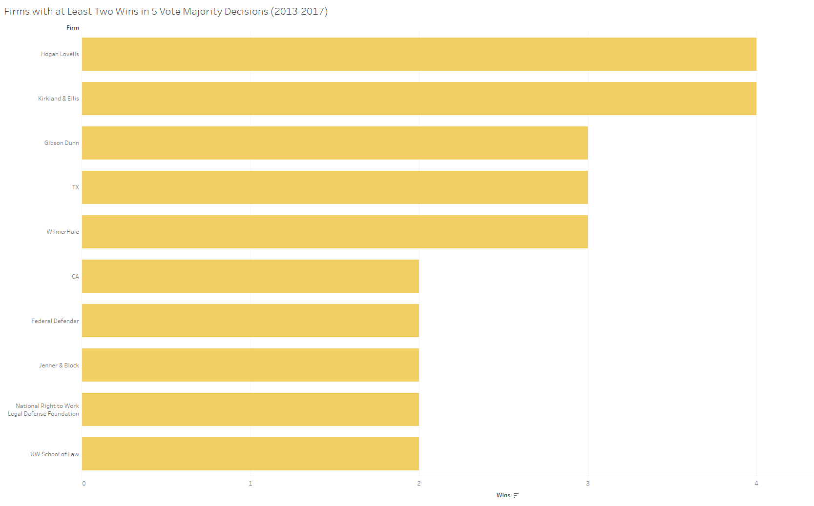 Neal Katyal’s firm, Hogan Lovells, and Paul Clement’s firm, Kirkland & Ellis, are atop this figure with four such wins, followed by Gibson Dunn, Texas’ S.G.’s office and WilmerHale. Other entities in this figure not yet mentioned in this post are California’s S.G.’s office, the Office of the Federal Defender, Jenner & Block and the National Right to Work Legal Defense Foundation.