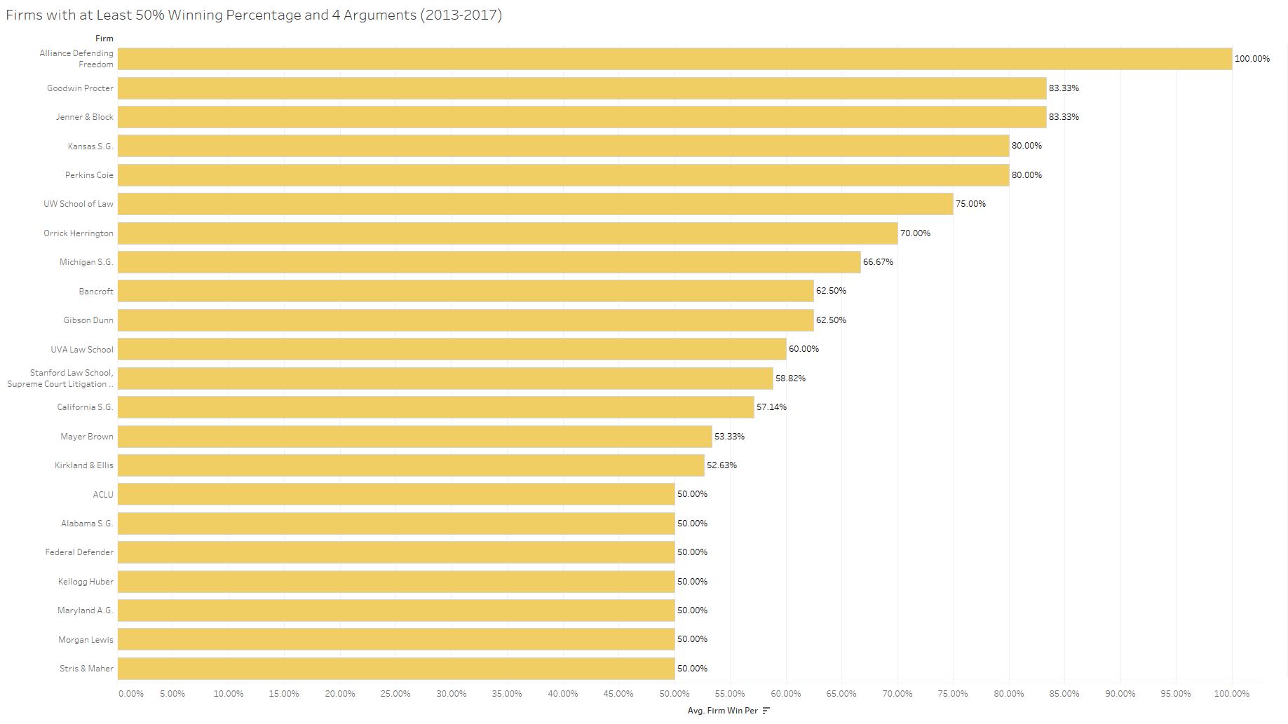 The top-performing firm was the Alliance Defending Freedom, which argues in favor of religious freedom, including in last term’s case Masterpiece Cakeshop, Ltd. v. Colorado Civil Rights Commission. The alliance won all four of its cases before the court during the five-year period. Rounding out the five top-performing firms in terms of winning percentages are Goodwin Procter, Jenner & Block, Perkins Coie and Orrick Herrington. Of those firms, attorneys from Jenner & Block argued the most cases with 18. The firm with the next most among those five is Orrick, with 10 arguments. The firm in this figure with the most arguments, however, is, as previously mentioned, WilmerHale, with 27 – the most for firms in this period.