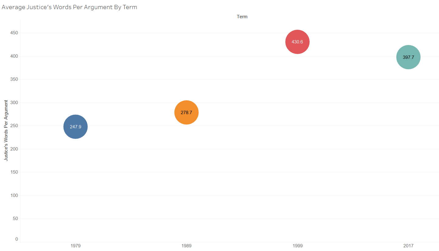 All of the current justices are fairly engaged in oral arguments with the exception of Justice Clarence Thomas. An increase in engagement is evident at both the aggregate court level and by individual justice. If we look at average words per justice per argument by term in these samples, there is an increase from 1979 through 1999 and then a slight dip in 2017 (The numbers for 1999 and 2017 are sufficiently close that the difference could be a factor of sampling.).