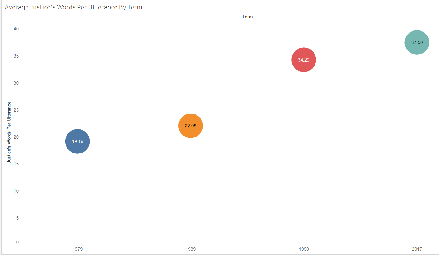 When we reframe this to look at justices’ words per talking turn, this measure increases in each subsequent term.