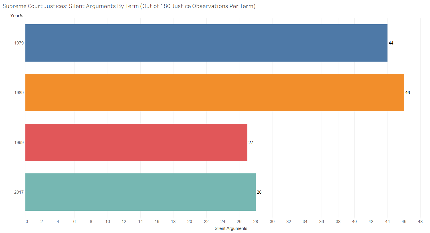 Even with Thomas’ silence in all 20 argument slots for the 1999 and 2017 terms, the sum of silent-justice slots in these two terms is well under the 44 from 1979 and 46 from 1989. This reflects a change in the court’s culture, as is detailed in the chapter from Johnson, Owens and Black, which can likely be ascribed to Scalia.