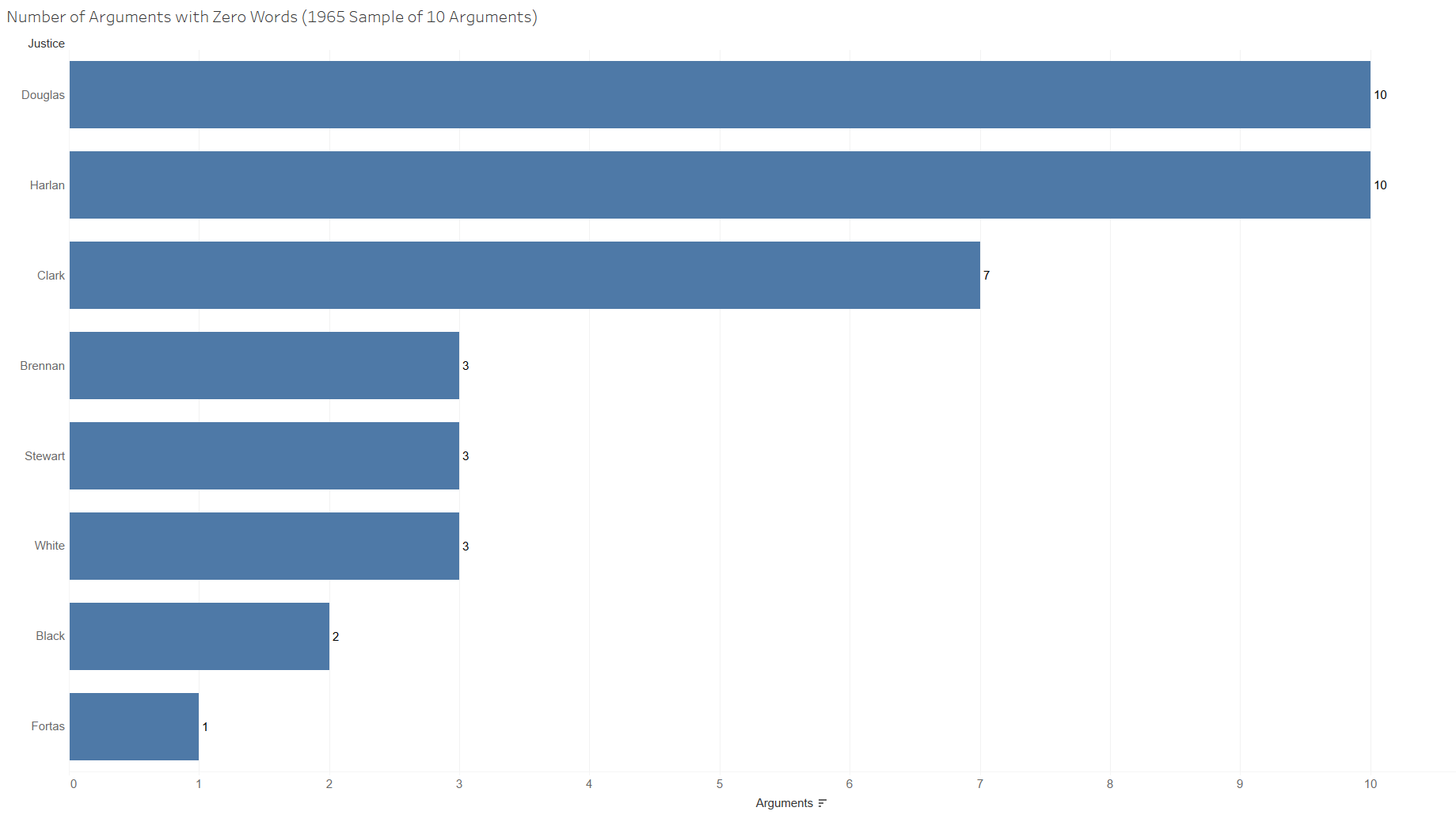Justices William Brennan, Harry Blackmun, Lewis Powell and Thurgood Marshall each were silent for multiple arguments in the 1979 and/or 1989 terms. When we push back to 1965, a full 42 percent of the 90 justices’ argument slots were silent, including all 10 from Justices William Douglas and John Marshall Harlan.