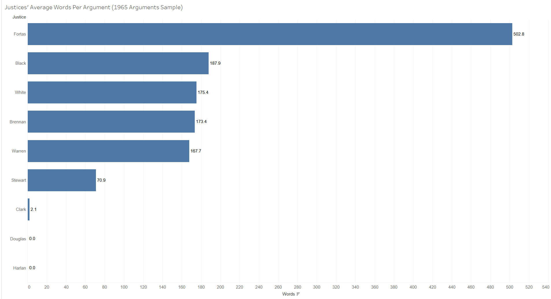 With silence decreasing over time, the justices’ words per argument increased. The justices were much less talkative in the 1965 term than they were in any of the subsequent terms measured for this post.