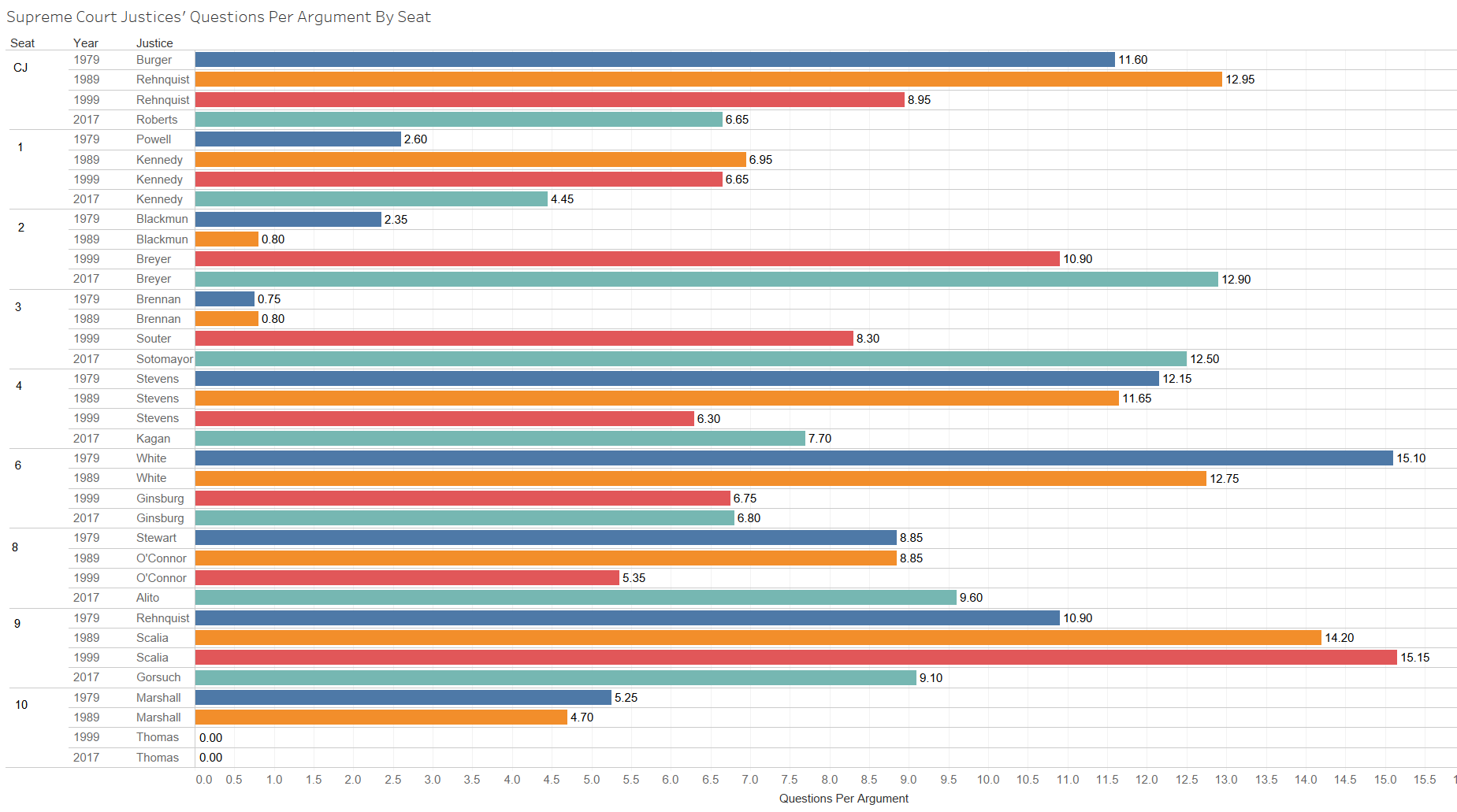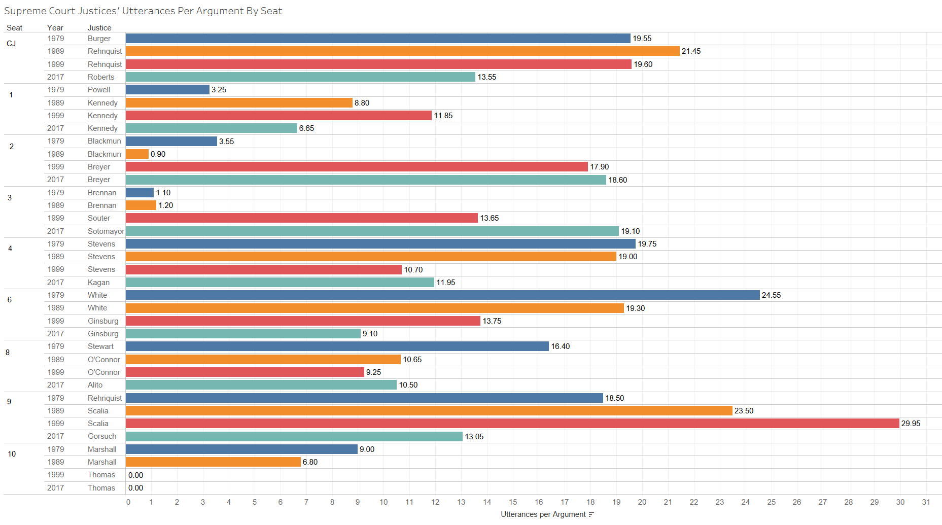 Only Justice Abe Fortas was in the range of average words per justice per argument for a modern justice. When we look by the justices’ seats we also see that the justices generally said more in the more recent terms.