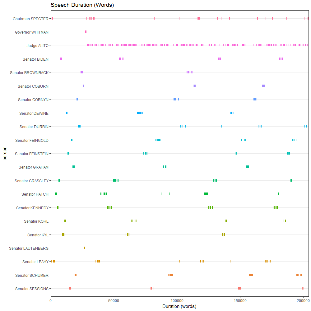 Graphs that track speech patterns look at the number of words spoken by each speaker and at the order of speakers. Moving sequentially through the nominees, we begin with Alito.