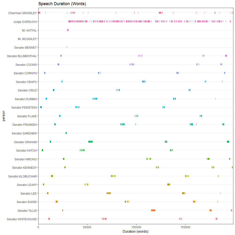 These speech statistics include the opening remarks of Neal Katyal and the one line from then-White House Counsel Michael McGinley, which was “I never thought I would carry a bag after graduating law school.” The senators appear to have evenly engaged Gorsuch in the hearings, although some of the distinctions are made more evident through the word statistics.