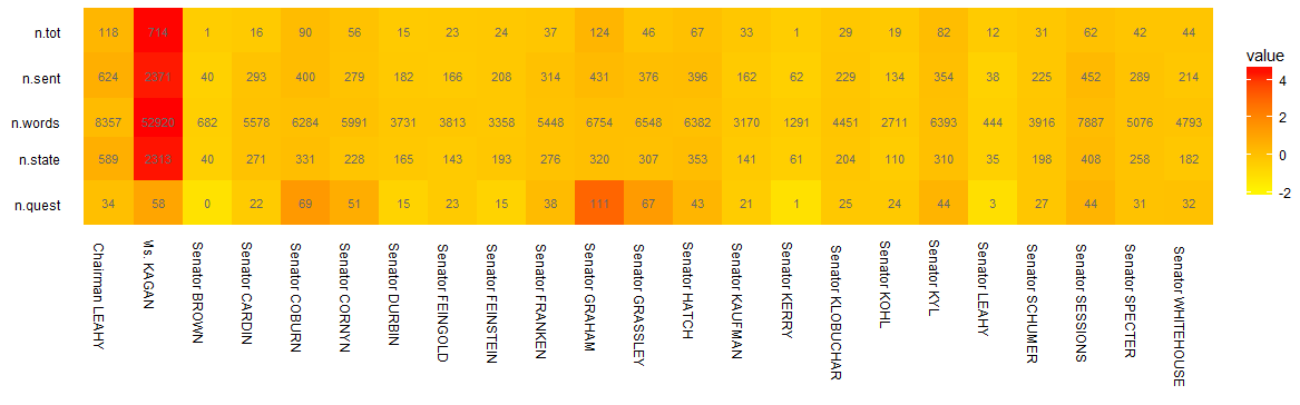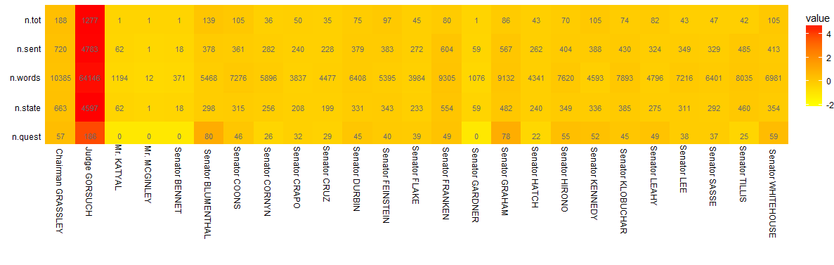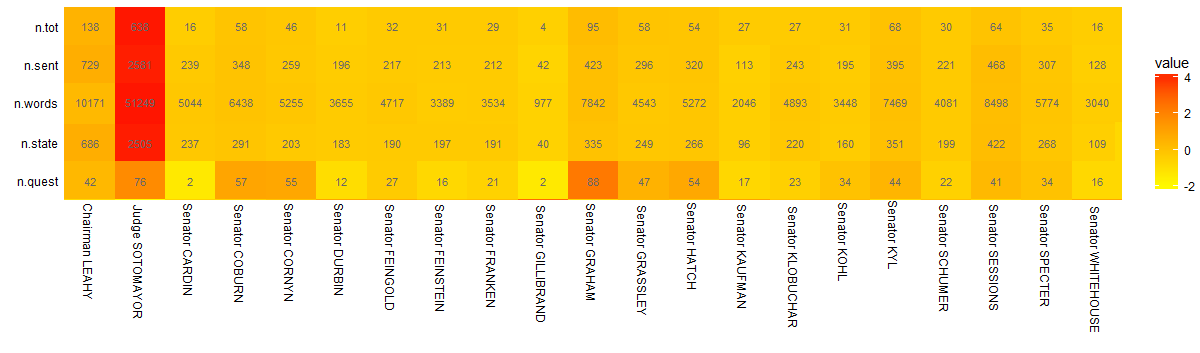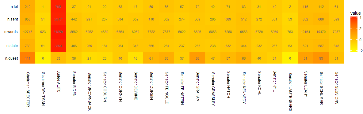 Breaking this down to the word statistics shows the amount of speech per senator. The row categories are n.tot for total utterances, n.sent for number of sentences, n.words for word count, n.state for statement count, and n.quest for question count.
