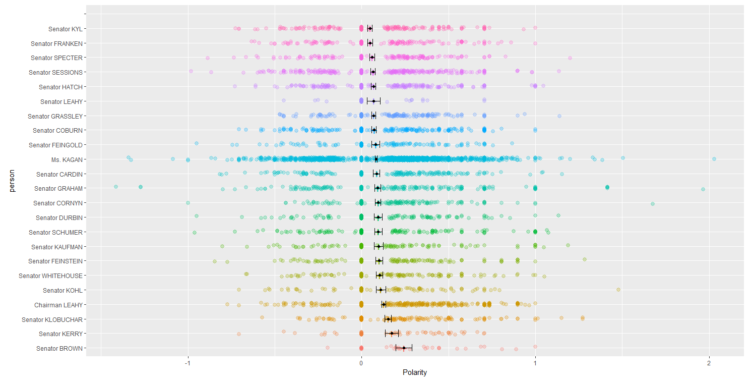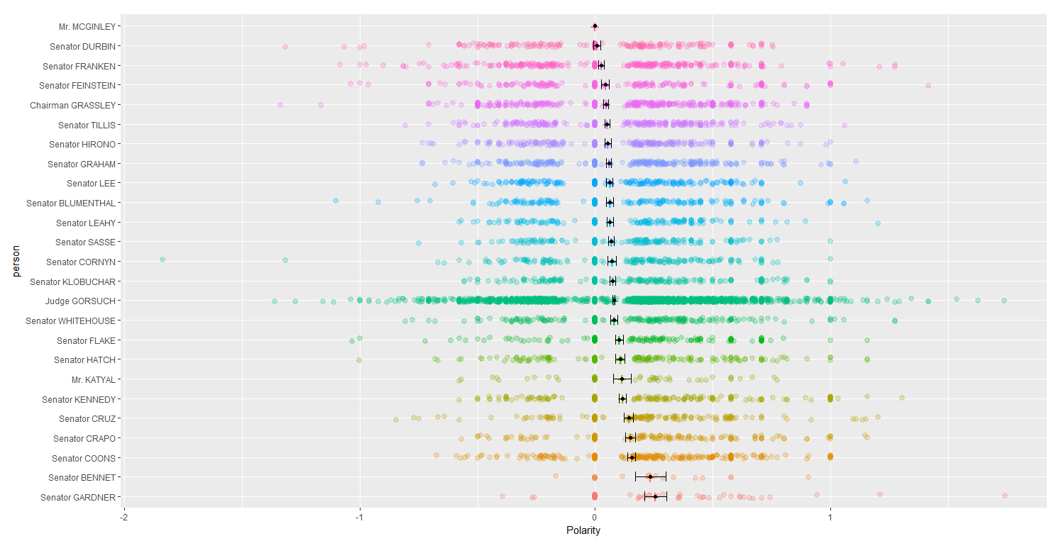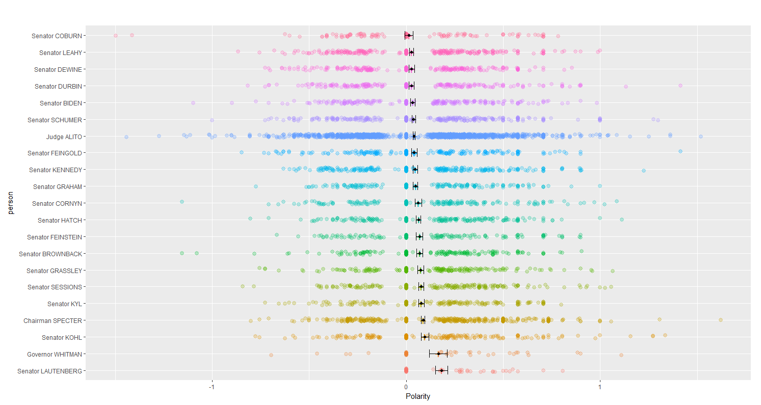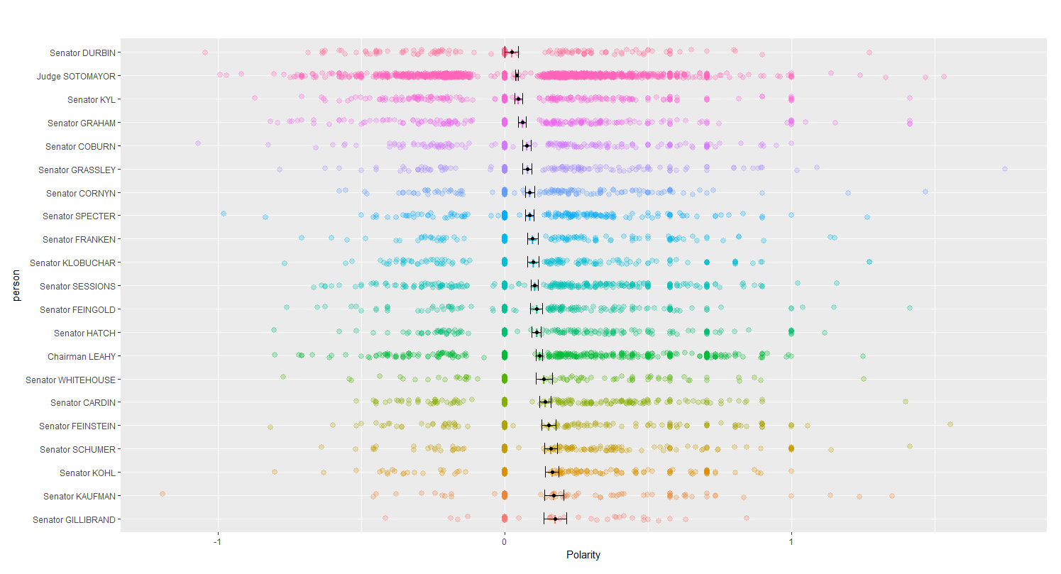 How about the tone of the senators’ comments? Note that the sentiment dictionary is not law- or politics-specific and so it might not pick up on all of the linguistic nuances. It does provide a useful gauge of the relative tone of each senator’s comments, though. The scores range from +1 for a positive sentiment to -1 for a negative sentiment, with zero as neutral.