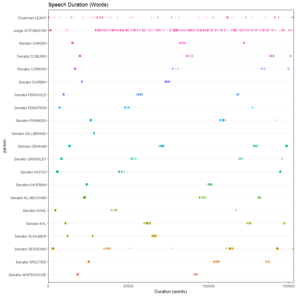 Leahy was the chairperson for Sotomayor’s hearing. He spoke the most of the senators, as is evident in the figure below.