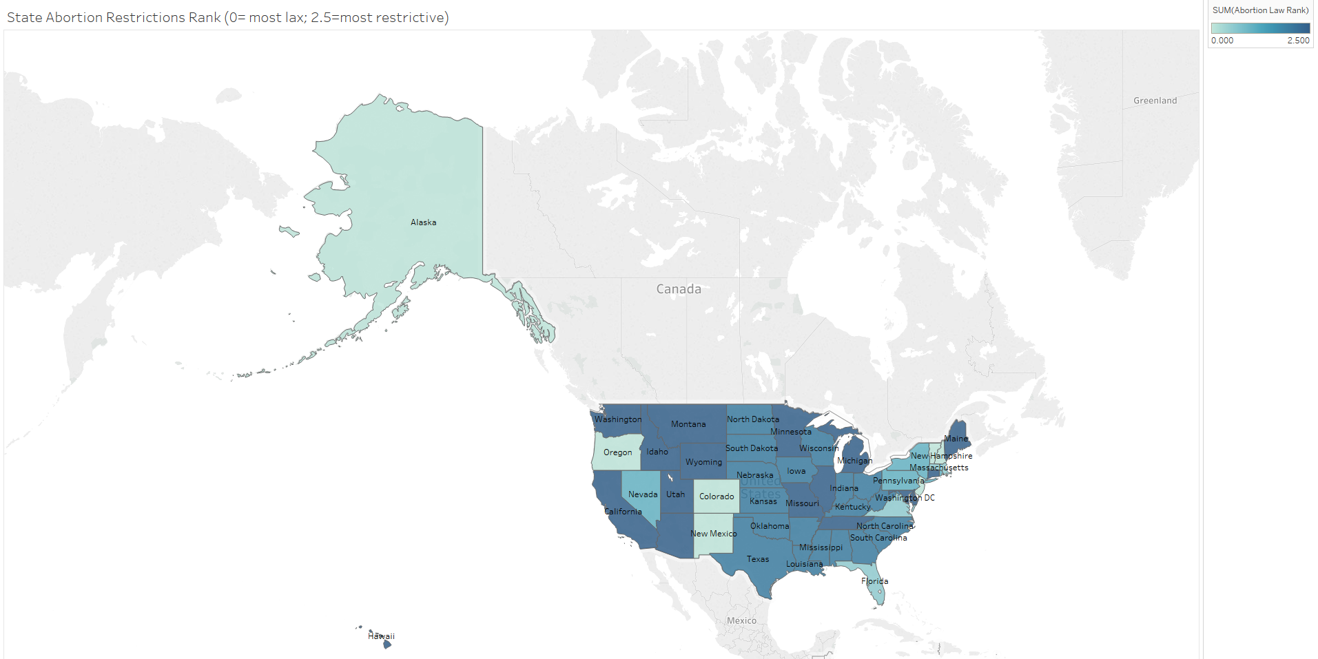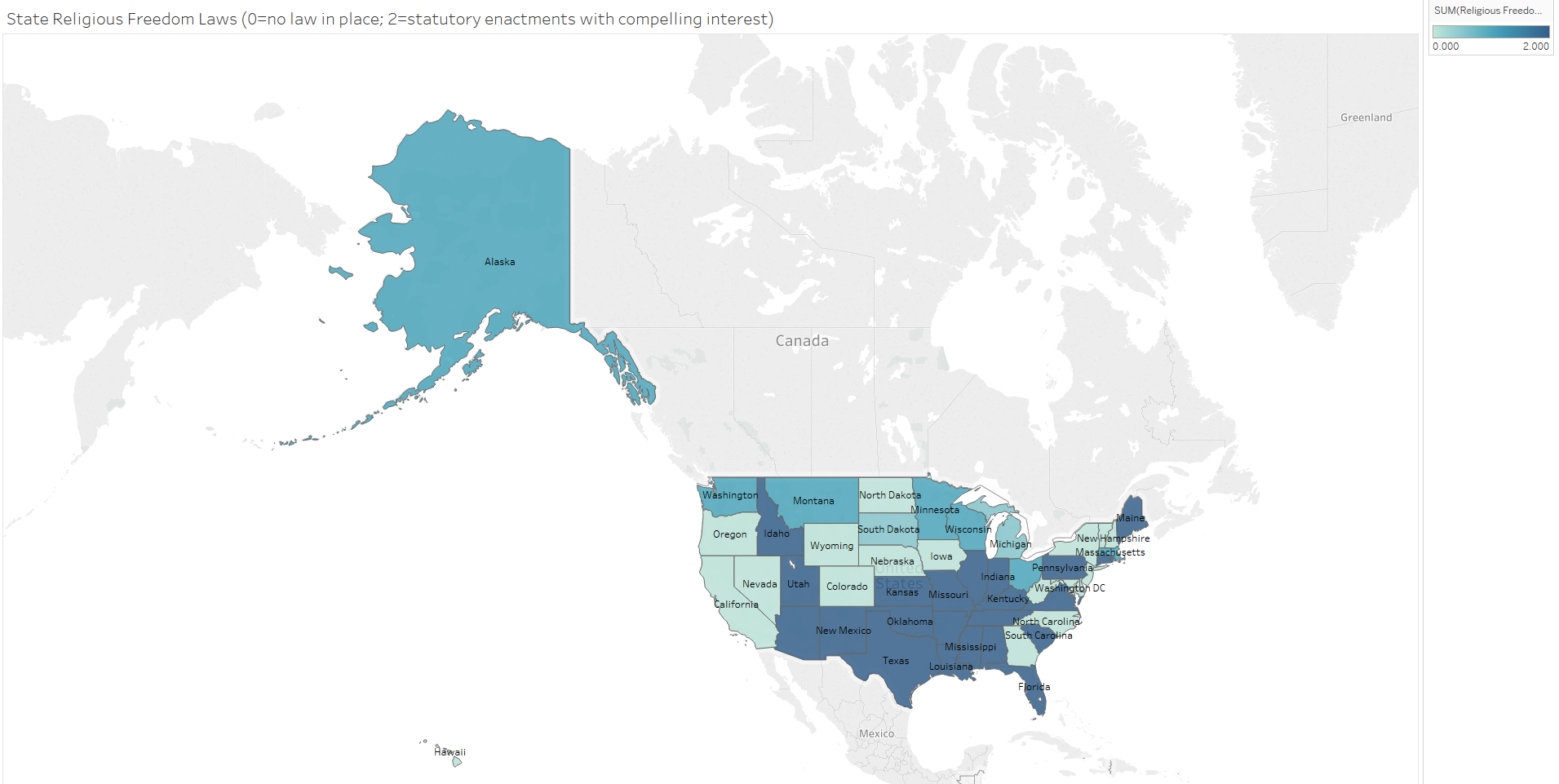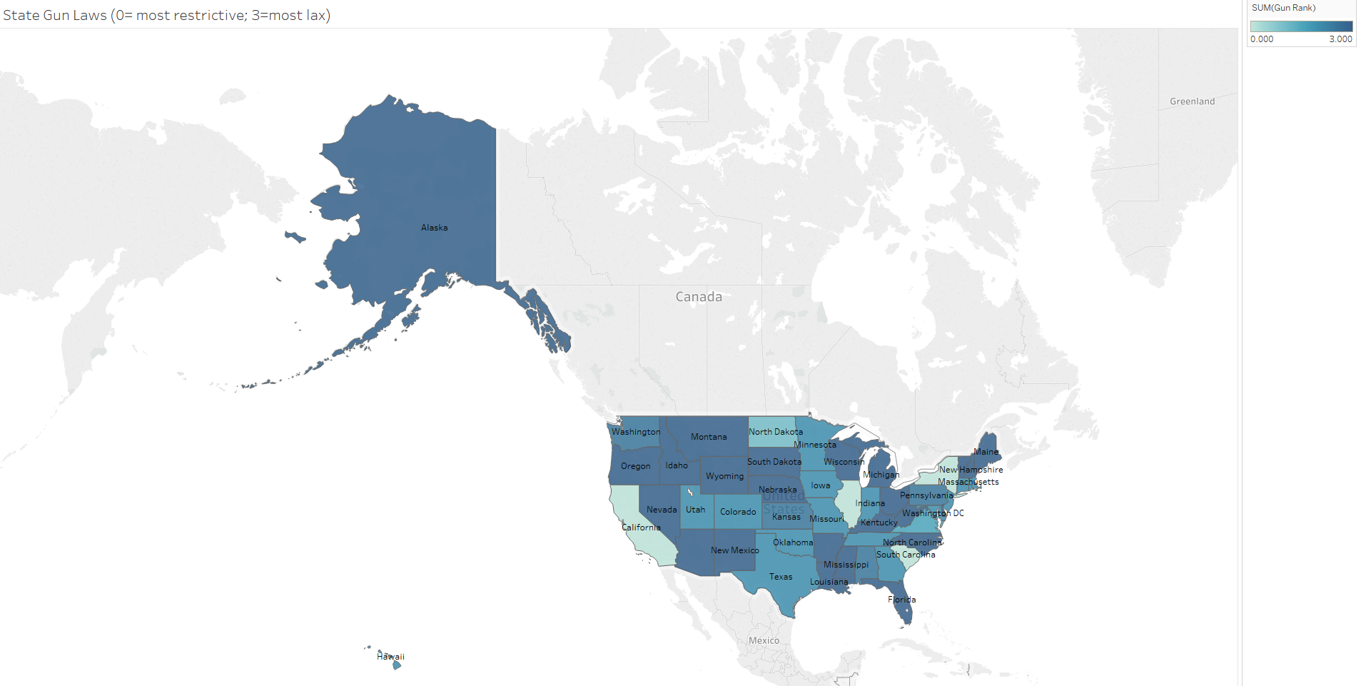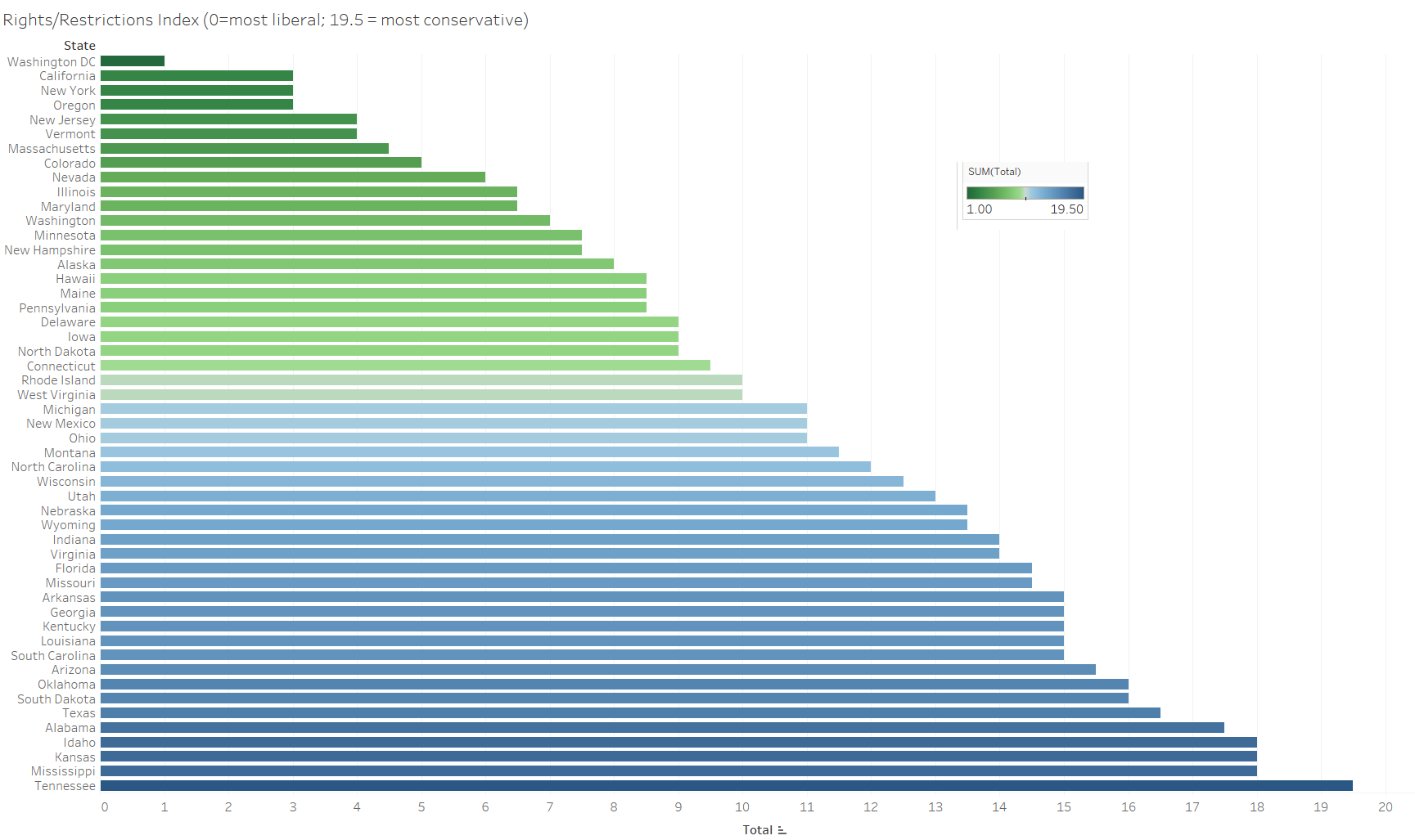 In this post, one dimension of an area of law is examined for each issue. This means for example that while gun-carrying laws are examined, laws regarding gun ownership are not. This might skew the picture a bit by area but also controls for how courts may differentially analyze similar issues across states. States’ policies in these areas were each scaled from 0 to 3.5 (when applicable due to sufficient gradations in state laws), with zero relating to a liberal approach and 3.5 equating to a more conservative policy.