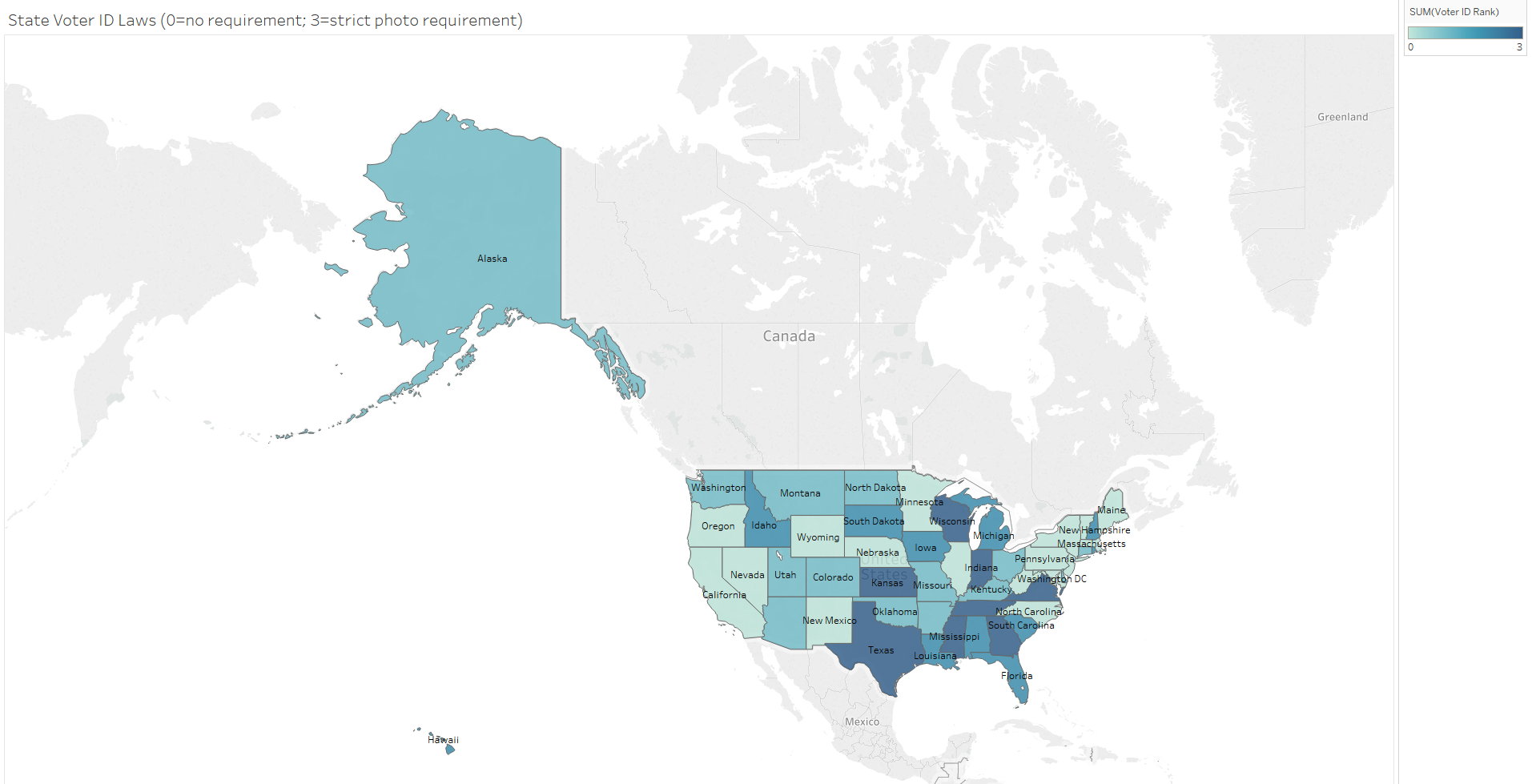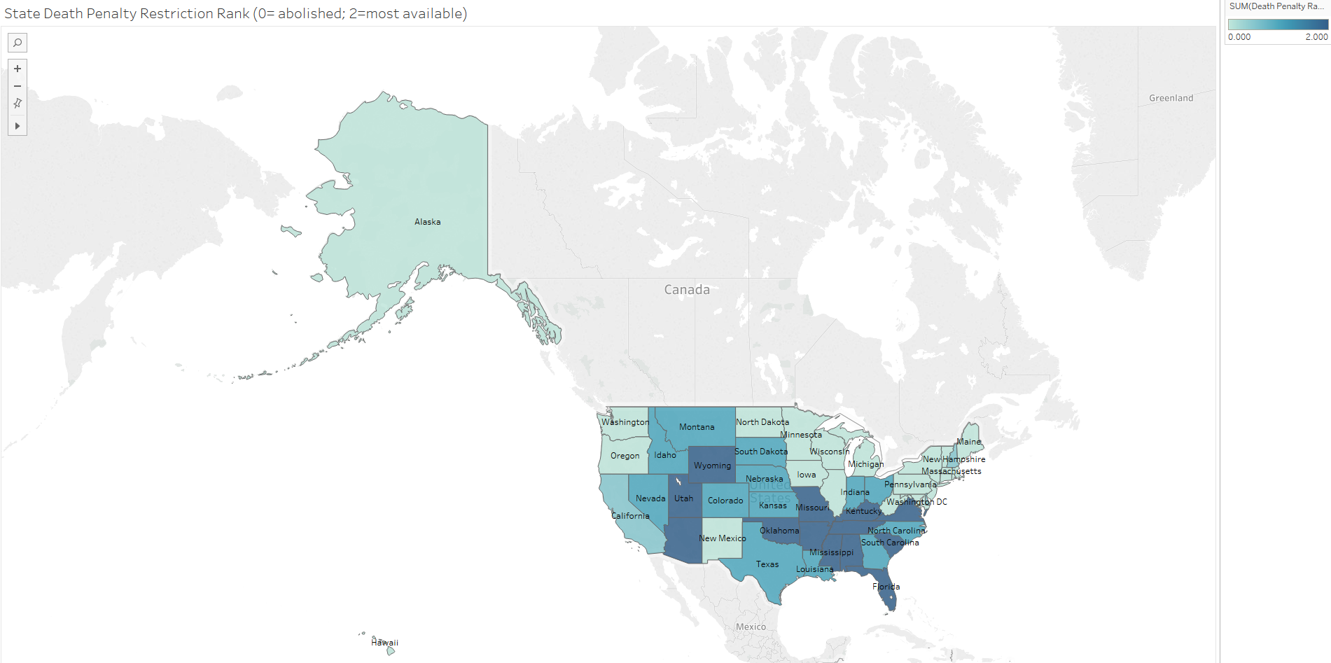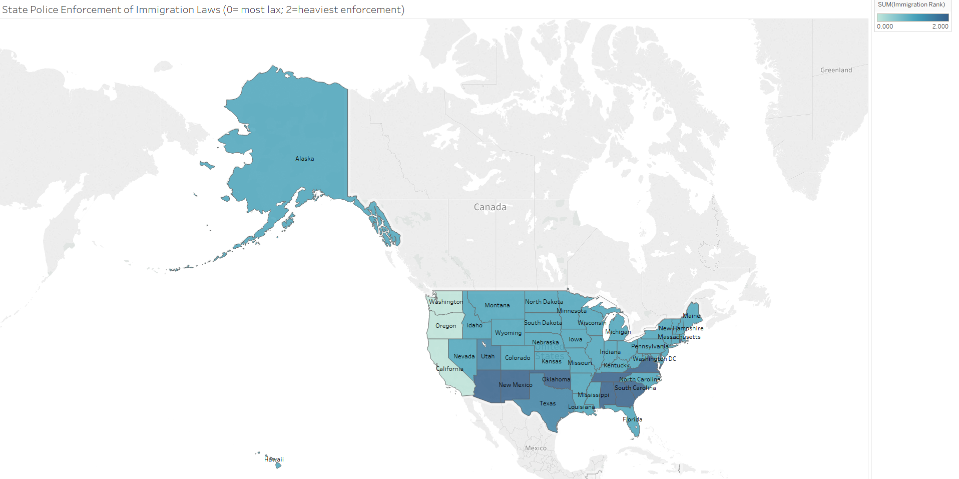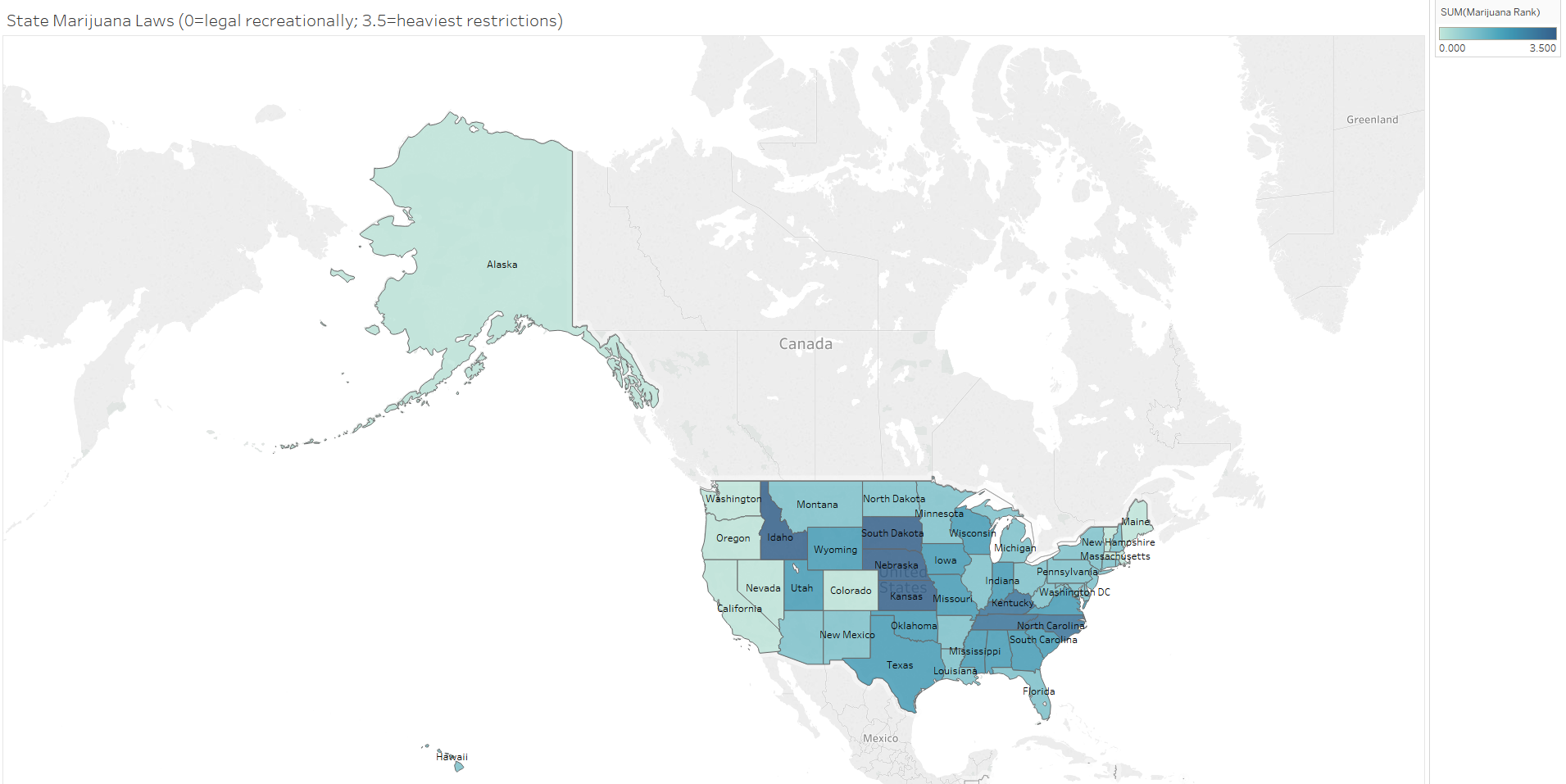 In this post, one dimension of an area of law is examined for each issue. This means for example that while gun-carrying laws are examined, laws regarding gun ownership are not. This might skew the picture a bit by area but also controls for how courts may differentially analyze similar issues across states. States’ policies in these areas were each scaled from 0 to 3.5 (when applicable due to sufficient gradations in state laws), with zero relating to a liberal approach and 3.5 equating to a more conservative policy.
