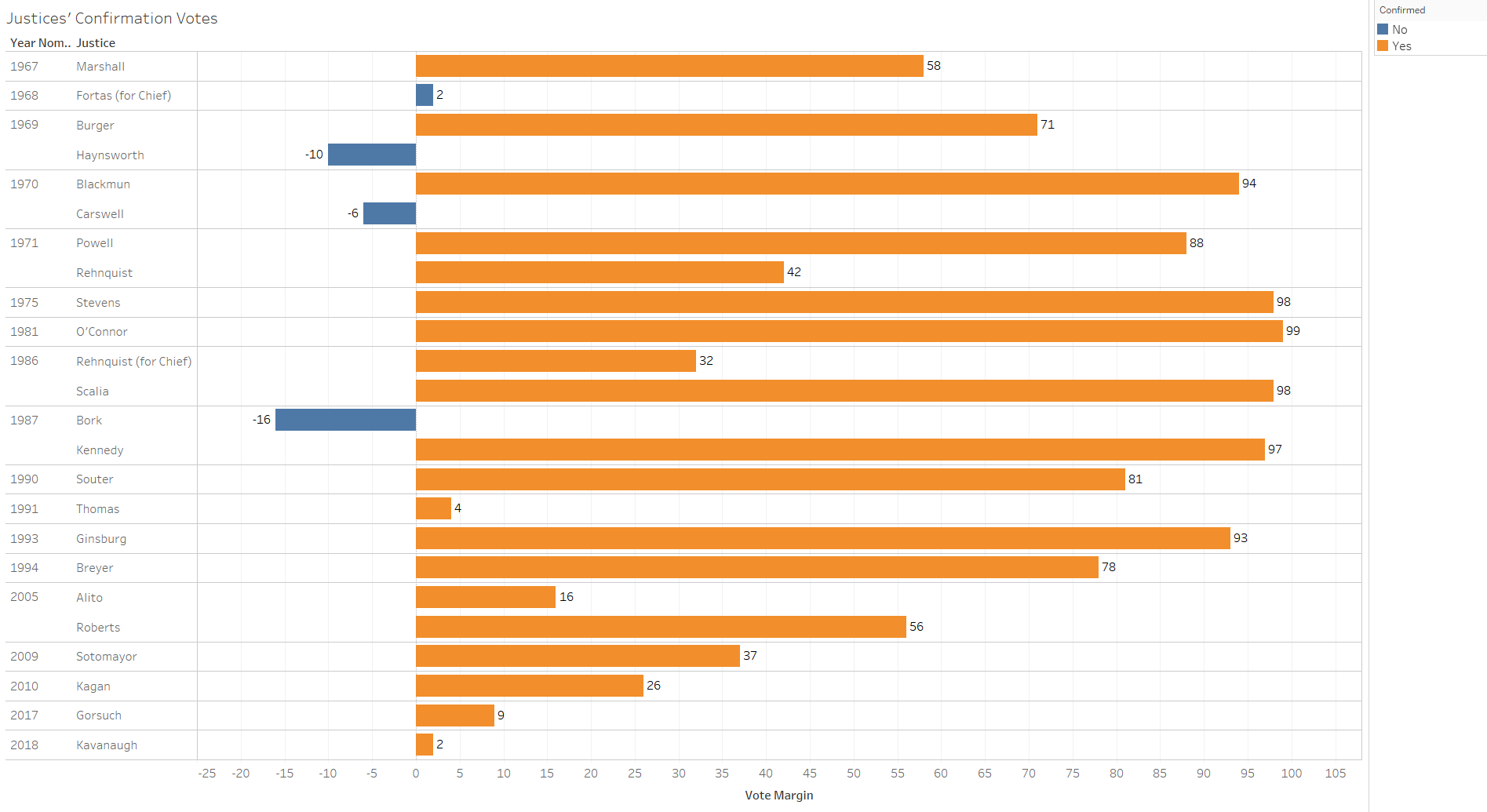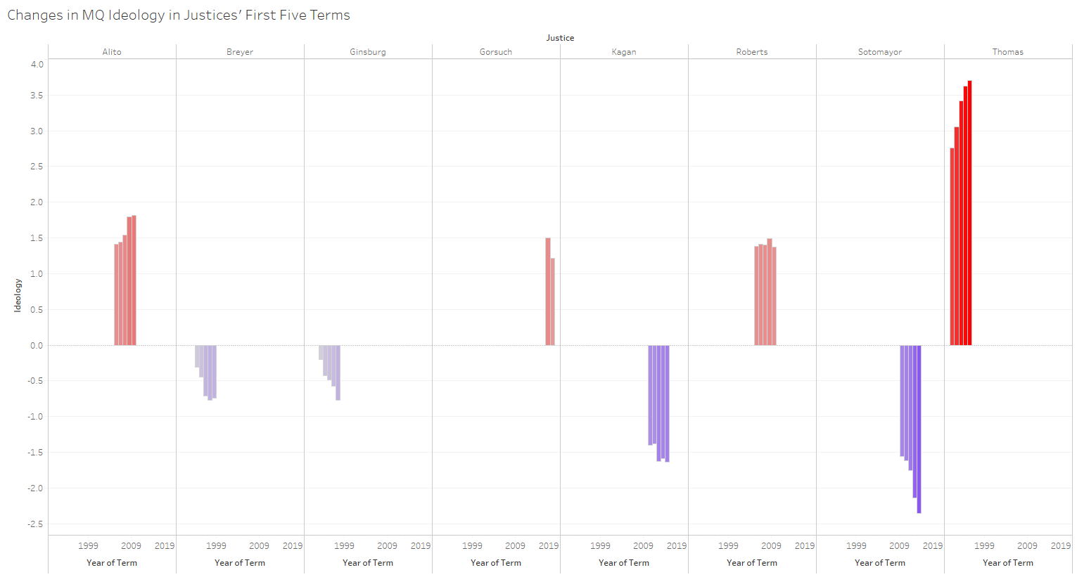 Looking back at the first figure, Ginsburg and Breyer were confirmed by the greatest margin of votes, while Thomas and Gorsuch had the fewest supporting votes of the sitting justices aside from Kavanaugh. Could a smaller voting margin portend less legitimacy among one’s peers on the Supreme Court? Might it cause a justice to feel greater frustration with the confirmation process? There are a few means to probe for answers to these questions.