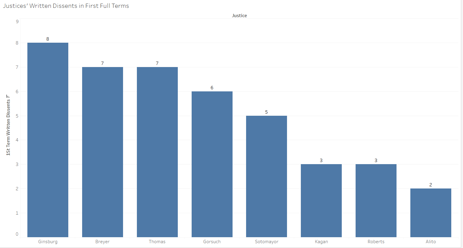 As we see, Ginsburg, Breyer and Thomas dissented the most in their first full terms, followed by Gorsuch. Because Ginsburg and Breyer were both confirmed by large majorities, the relationship between written dissents and confirmation-vote margin is not robust.