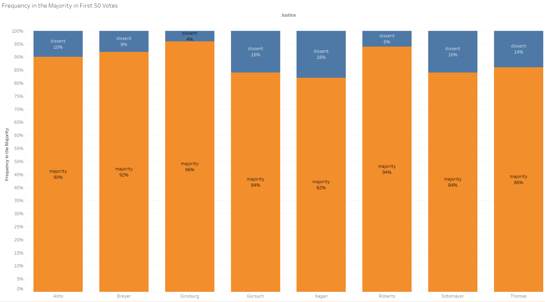 Only four justices were in the court’s majority less than 90 percent of the time in their first terms – Kagan, Sotomayor, Gorsuch and Thomas. Ginsburg was in the majority the greatest percentage of the time of all of the sitting justices. This measure holds some promise in terms of its relationship to the margin of a justice’s confirmation vote, and we’ll have to wait and see whether Kavanaugh falls to the lower end of this metric relative to his colleagues.