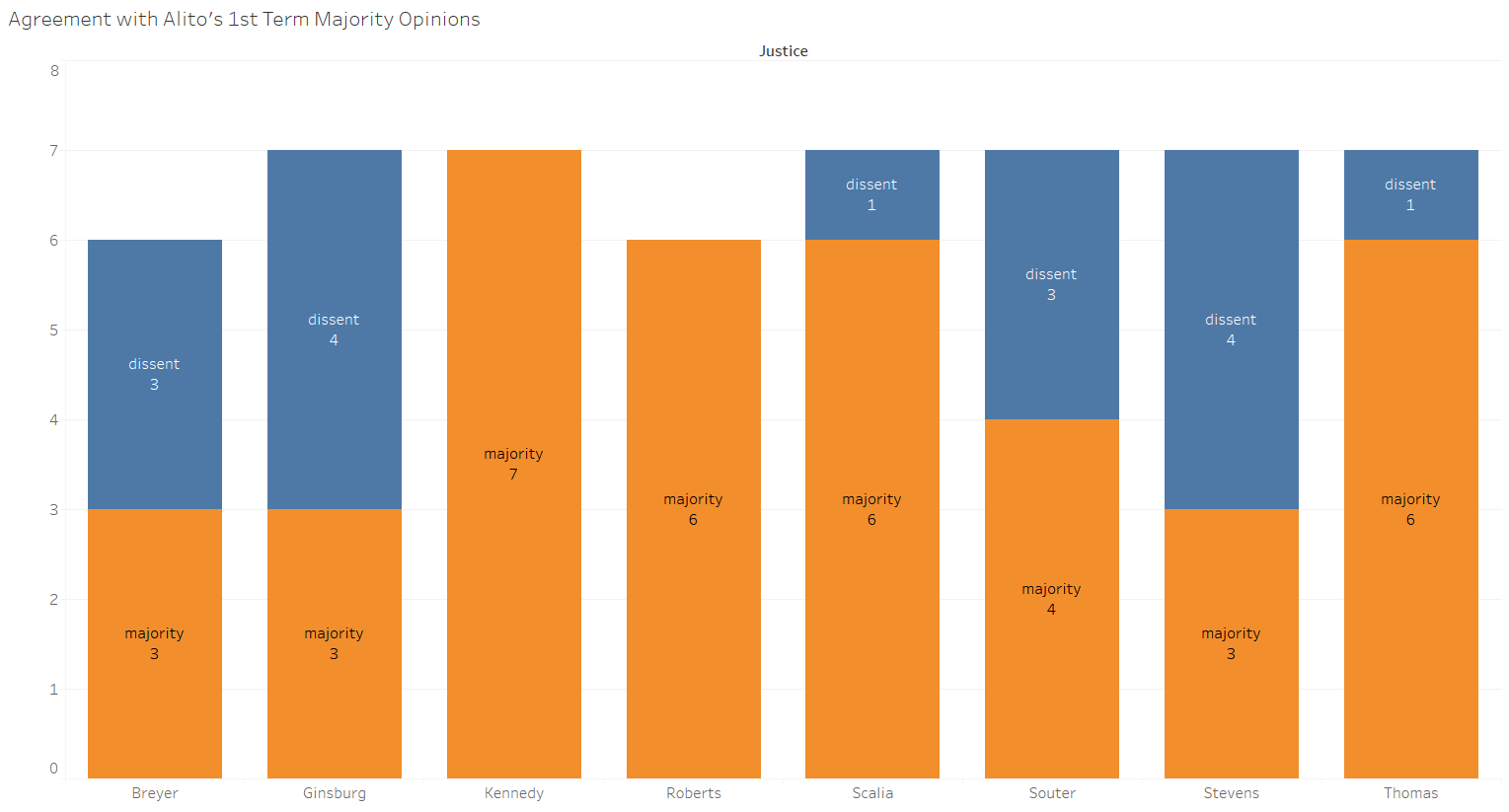 During Alito’s first full term, for instance, the more liberal justices were much more frequent dissenters from his majority opinions than were the conservative justices.