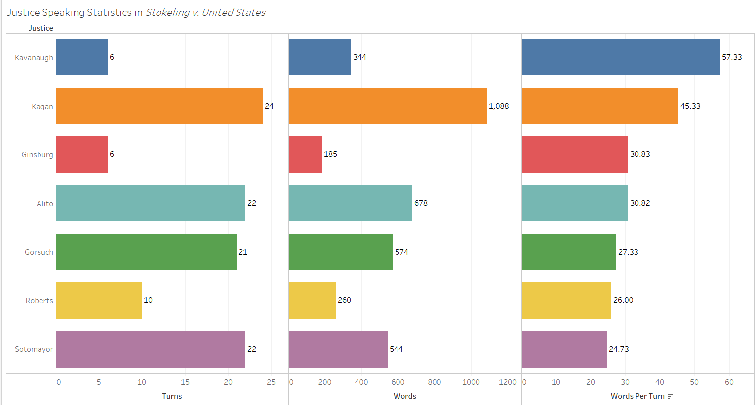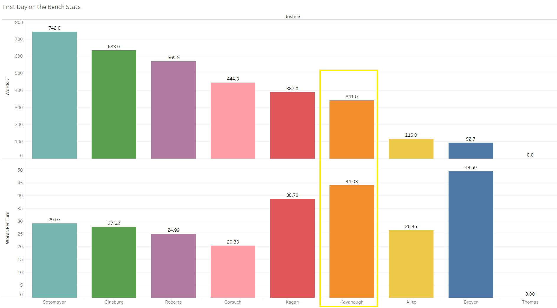 The justices also heard argument yesterday in U.S. v. Stitt. When looking at Kavanaugh’s first-day speaking statistics as compared to the those of his fellow justices, he was on the low end for average words spoken (Thomas did not speak on his first day), but had more average words per turn than all justices except Justice Stephen Breyer.