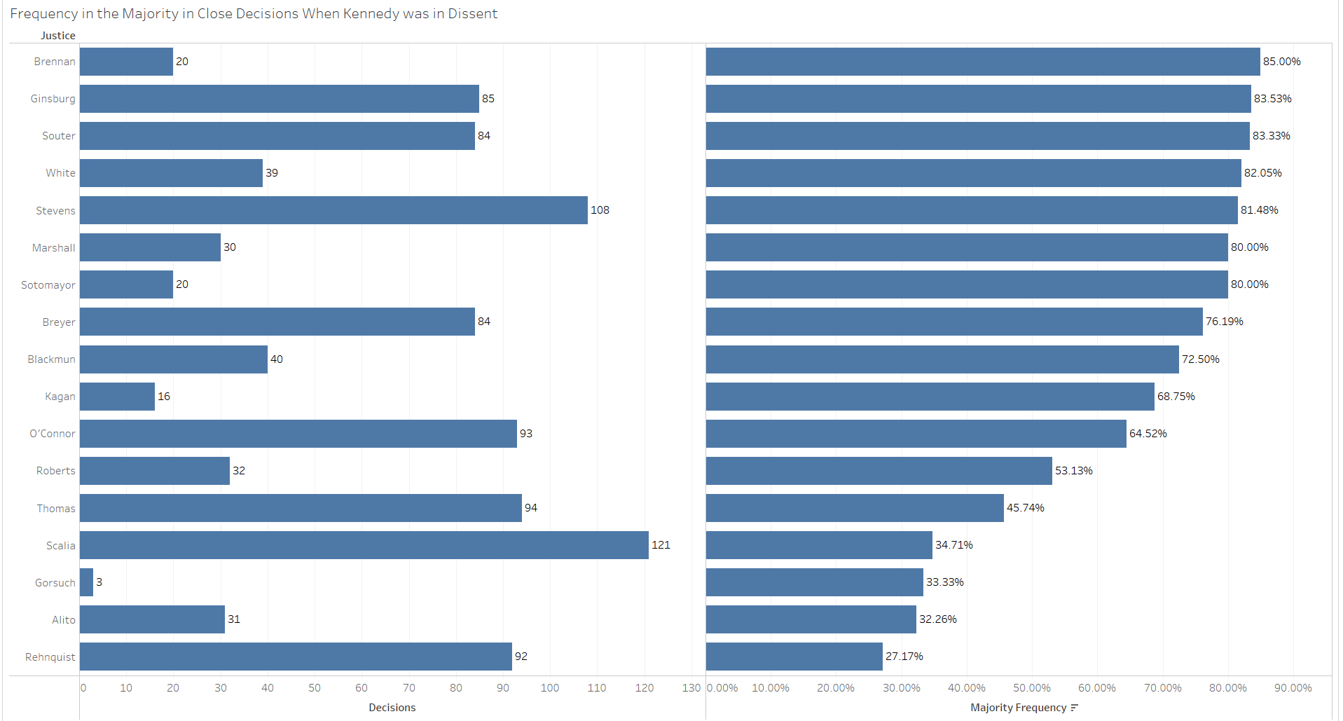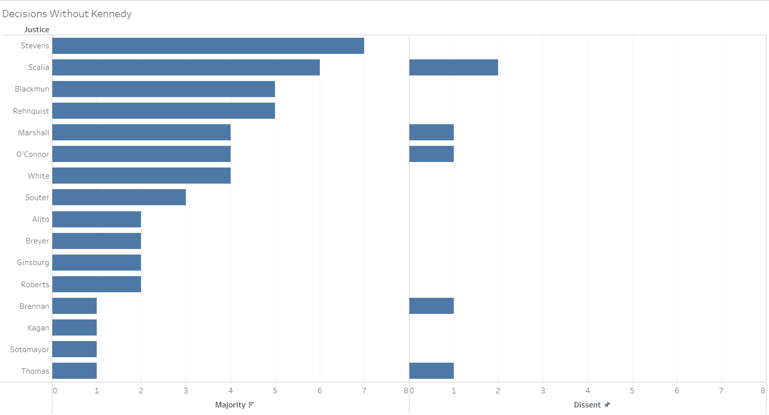 Justice John Paul Stevens voted in the most decisions in instances when Kennedy sat out. Although little else can be extracted from these data, Justice Antonin Scalia dissented more than any other justice.