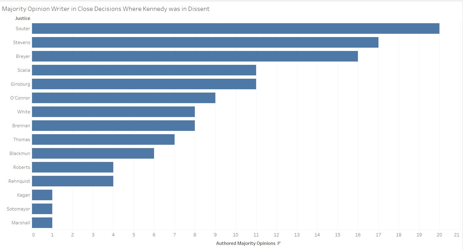 Stevens and Scalia participated in the most of these cases, with Stevens in the majority in many more instances than Scalia. This figure helps clarify that close decisions when Kennedy was in dissent often moved in the liberal direction. The justices most frequently in the majority in these decisions were more liberal justices, including Justices William Brennan, Ruth Bader Ginsburg and David Souter, along with Stevens, Justices Thurgood Marshall and Sonia Sotomayor, and others. Chief Justice William Rehnquist was least frequently in the majority in such decisions.