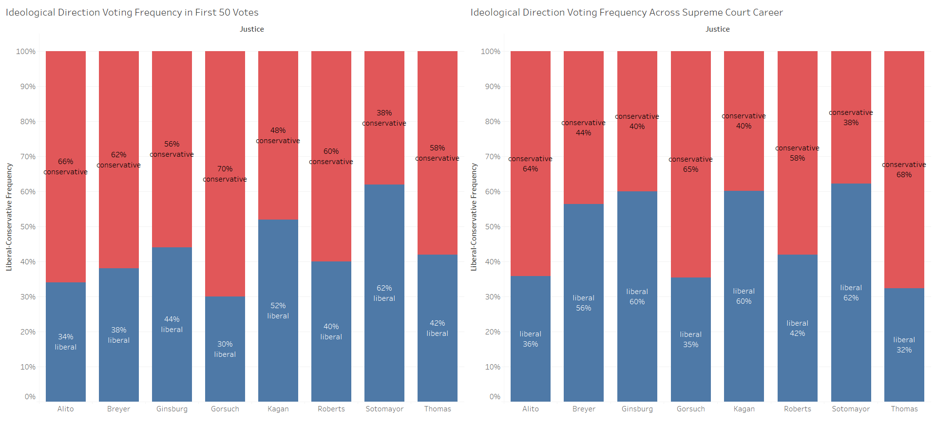 This trend basically holds true when looking at the justices’ voting behavior as either liberal or conservative and comparing their first 50 votes with their career track records on the Supreme Court.