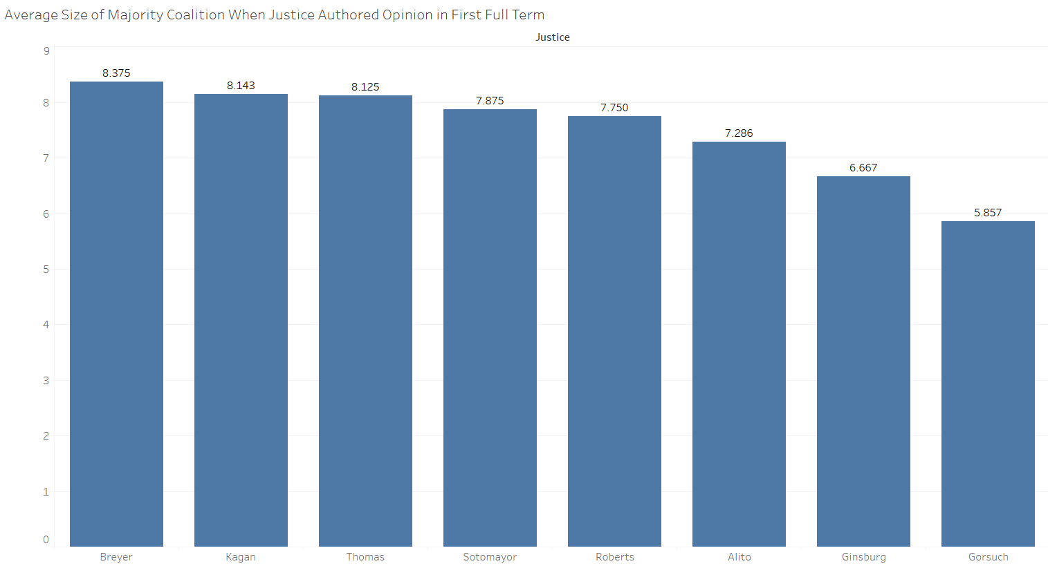 This metric likely measures the relative fracturing nature of the decisions assigned to a justice as much as or more than it does the other justices’ views of the recently confirmed justice. This is apparent as Thomas’ majorities are toward the high end for majority-coalition size, while Gorsuch had the lowest average majority-coalition size, followed by Ginsburg. Gorsuch had more 5-4 decisions last term (his first full term) than any of the other justices on the court, while Thomas is known for being assigned relatively noncontentious decisions.