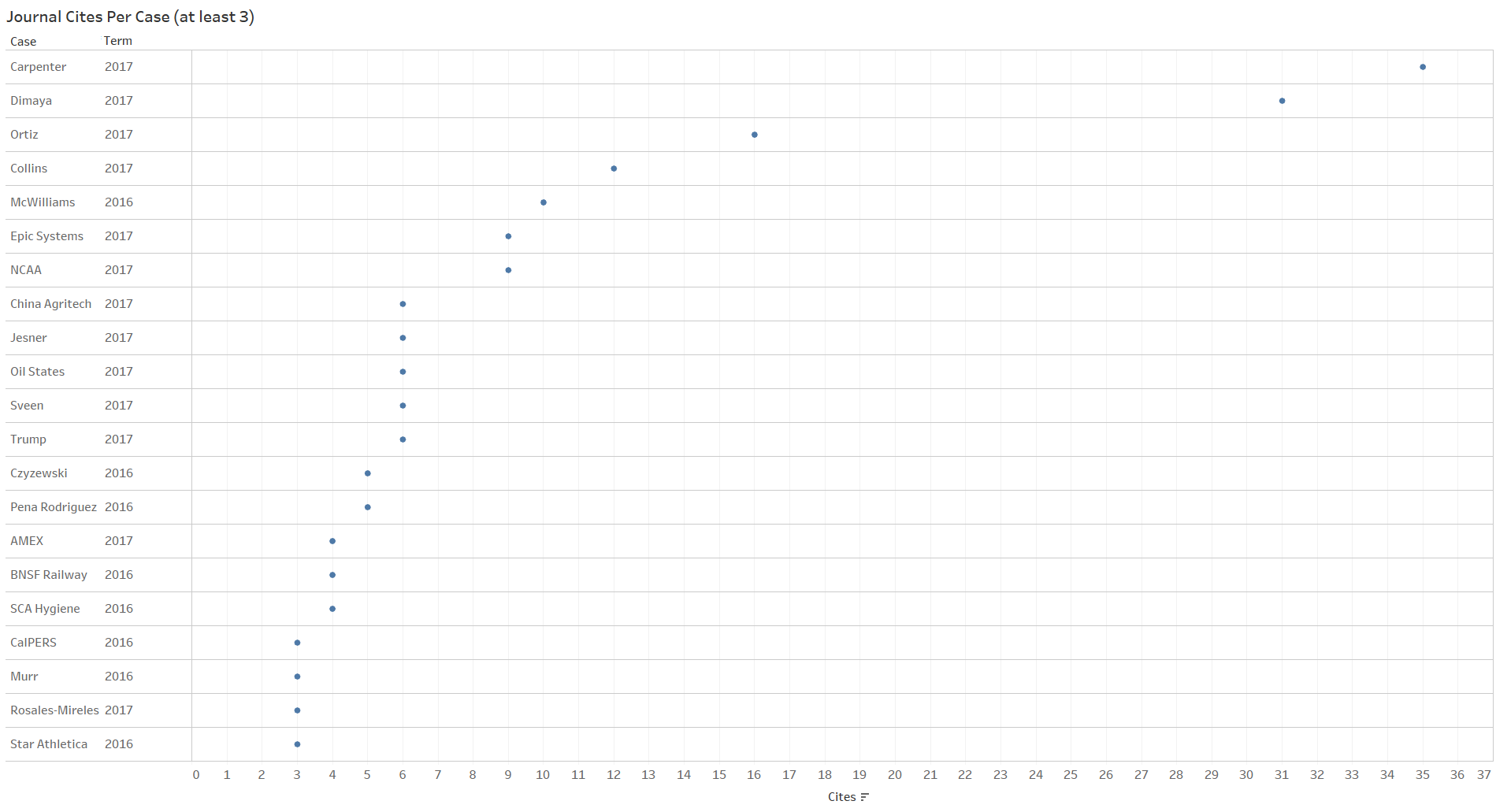 As you can see, there is a significant drop-off from the 35 observations in Carpenter v. U.S. and 31 in Sessions v. Dimaya to the 16 in Ortiz v. U.S. and 12 in Collins v. Virginia (Notice also that all four of these cases with the most citations to journal articles were heard during the 2017 term.).