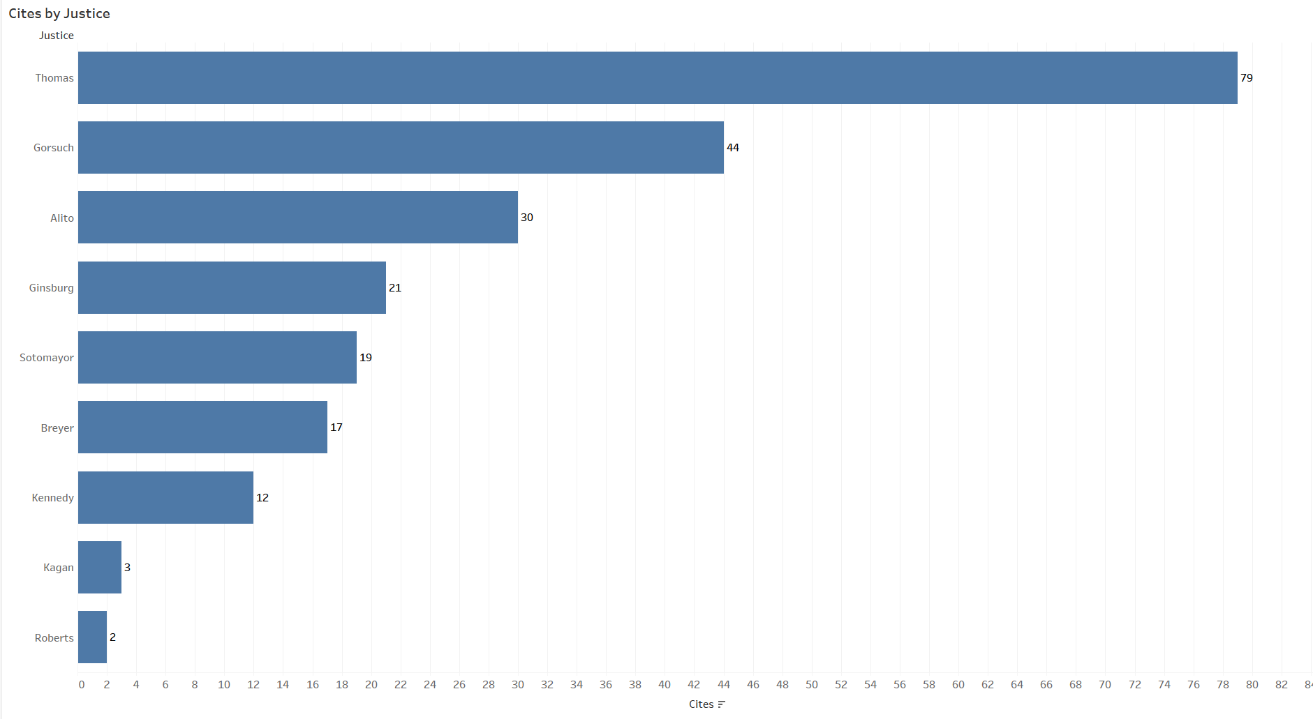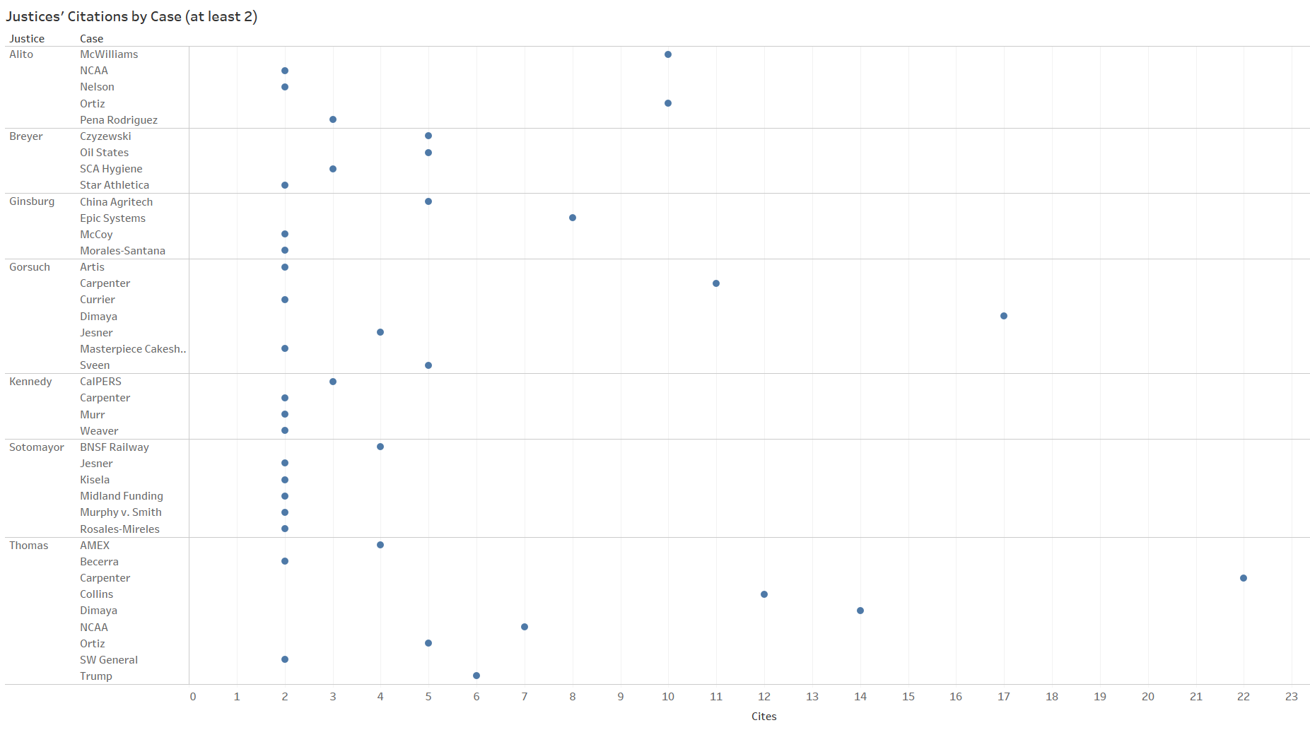 Not surprisingly, Thomas had the most citations for any justice-case with his 22 in Carpenter. Gorsuch had the next most with 17 in Dimaya. Overall there were 39 instances when a justice cited more than one journal article.