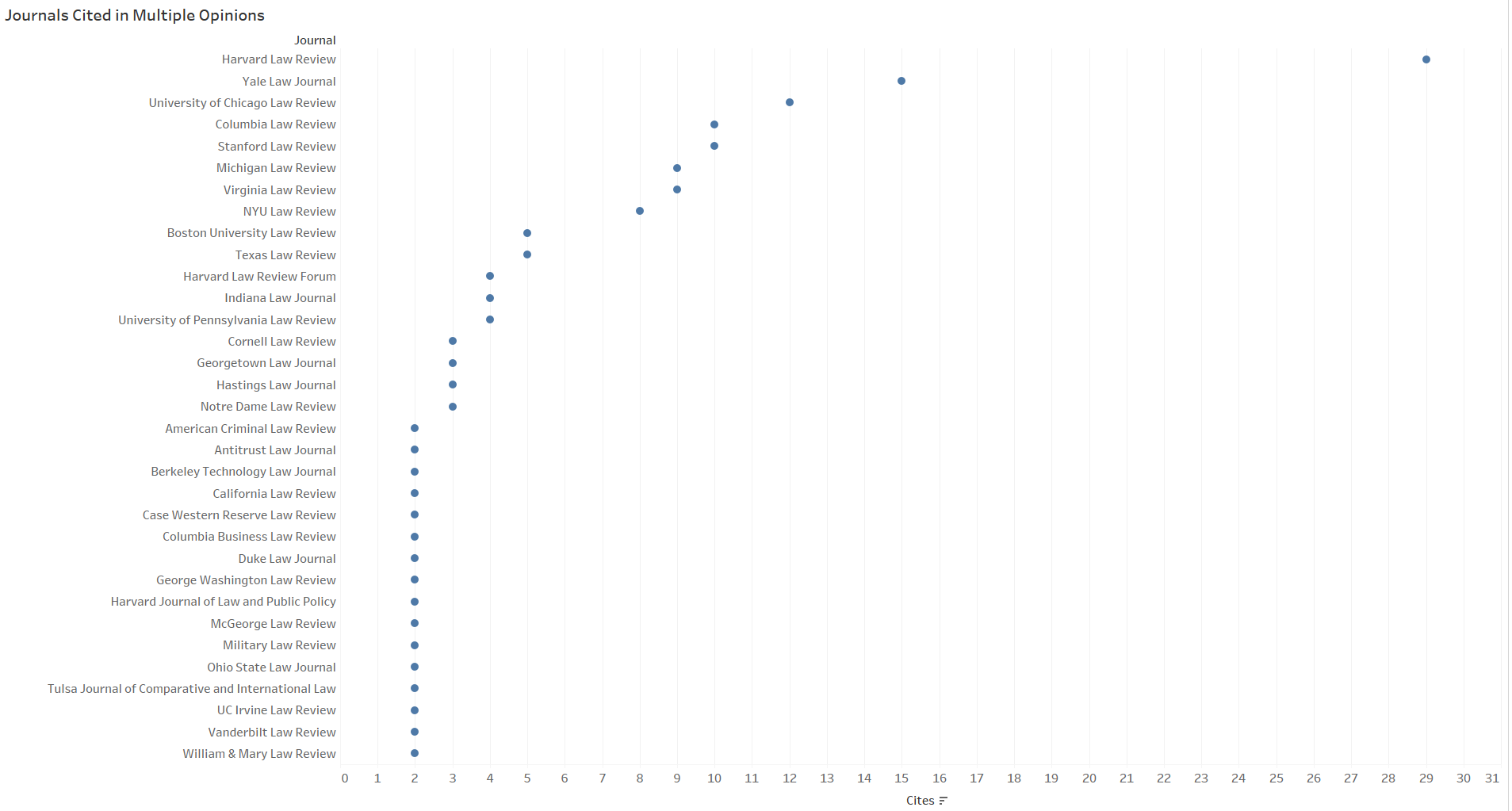 Looking at this practice from another angle, we can see that the justices tended to cite elite law reviews most frequently, although they cited a wide variety of law journals across all opinions.