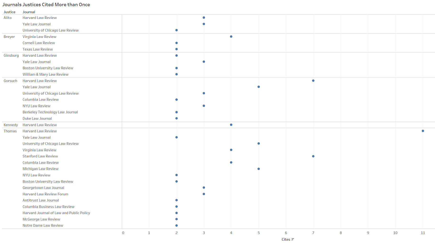 Justices also had their predilections for particular journals during these two terms, or at least they tended to cite articles from some journals and not others. Justices with multiple opinion-cites to specific journals are shown below.