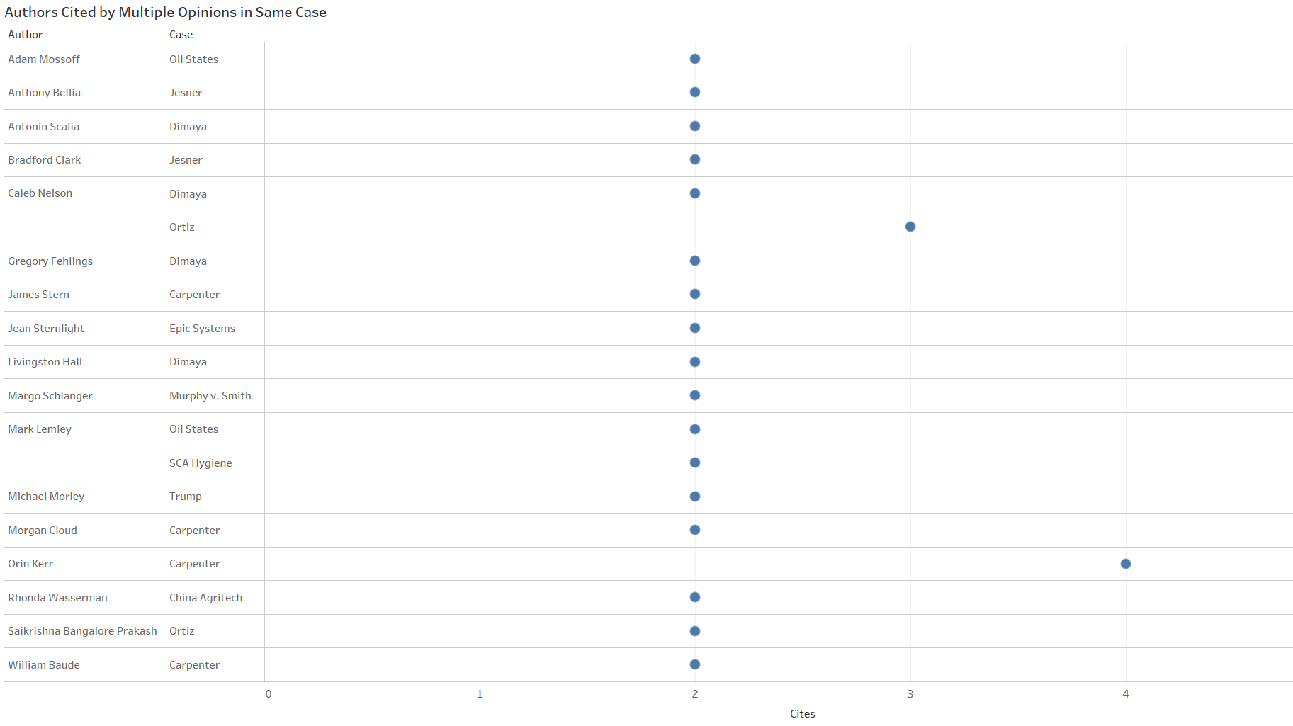Nelson along with Mark Lemley were the only two authors with multiple observations in multiple cases. Both appear prominently in the next chart as well that looks at all authors with multiple observations, including within the same case and between cases.