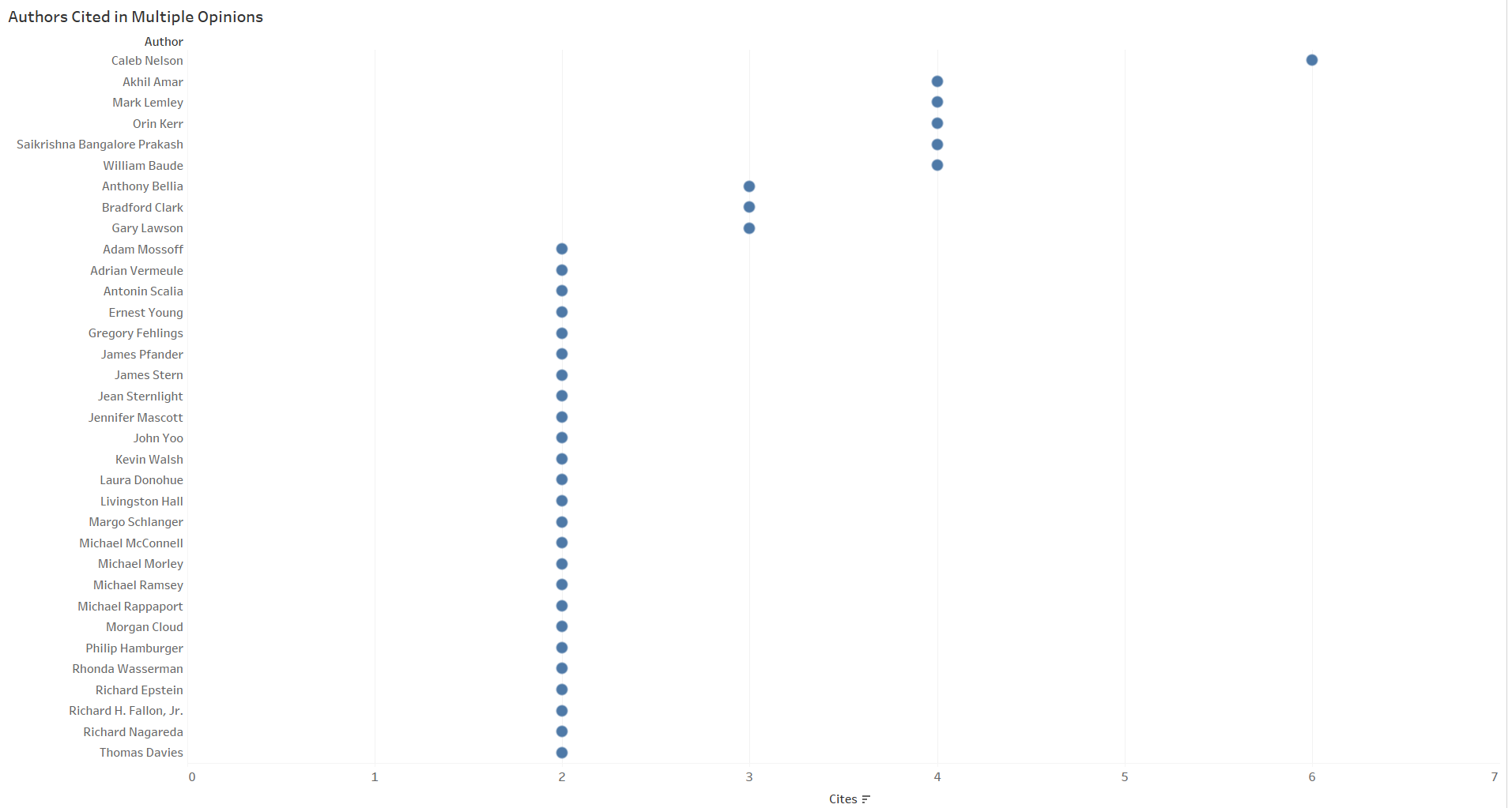 Along with Nelson’s three observations in Ortiz and two in Dimaya, Thomas cited Nelson in his concurrence in Trump v. Hawaii. Several authors were cited in four observations, including Orin Kerr, Akhil Amar, Mark Lemley and Saikrishna Bangalore Prakash. Three authors were cited in three observations – William Baude, Anthony Bellia and Bradford Clark.