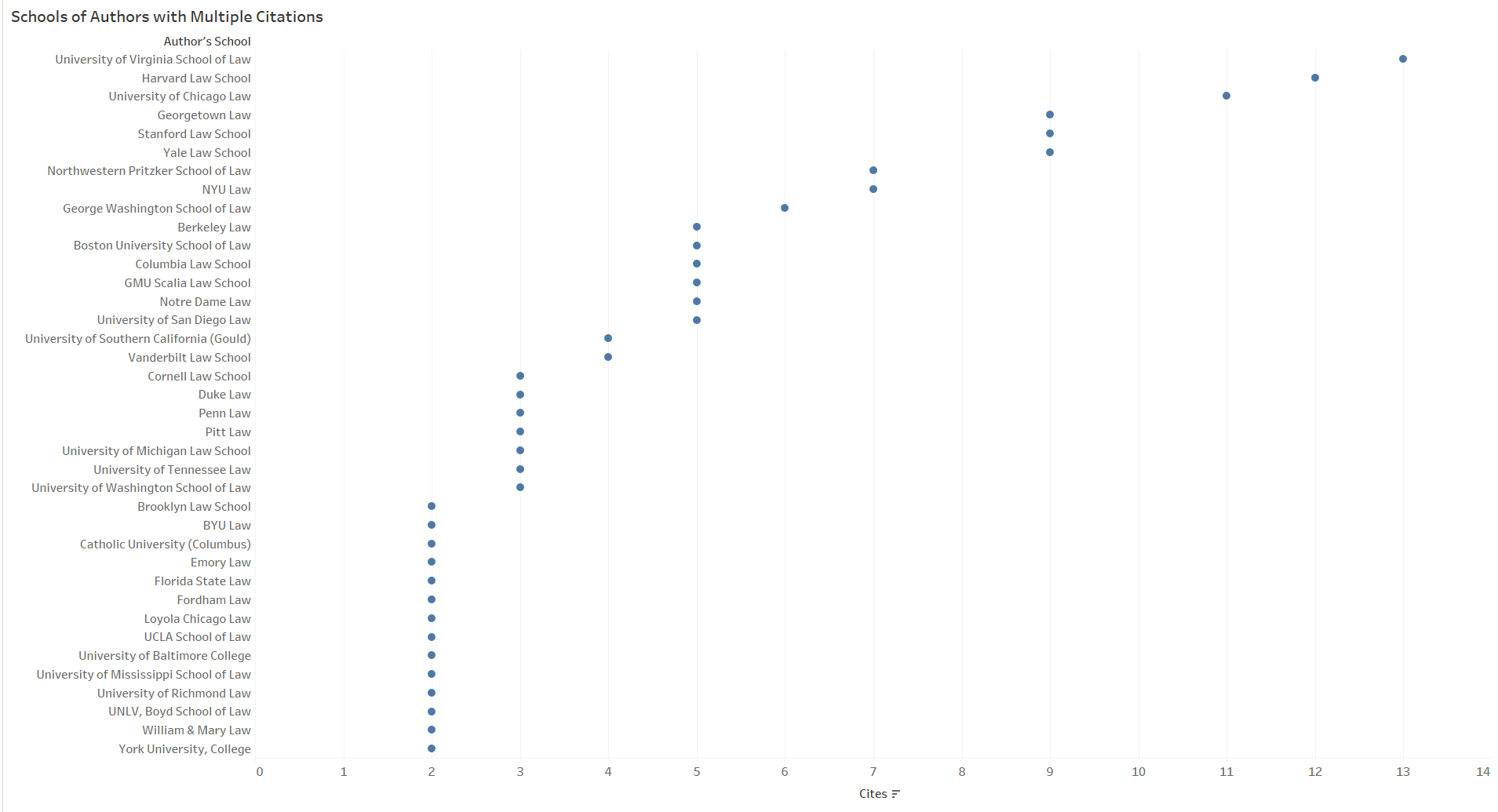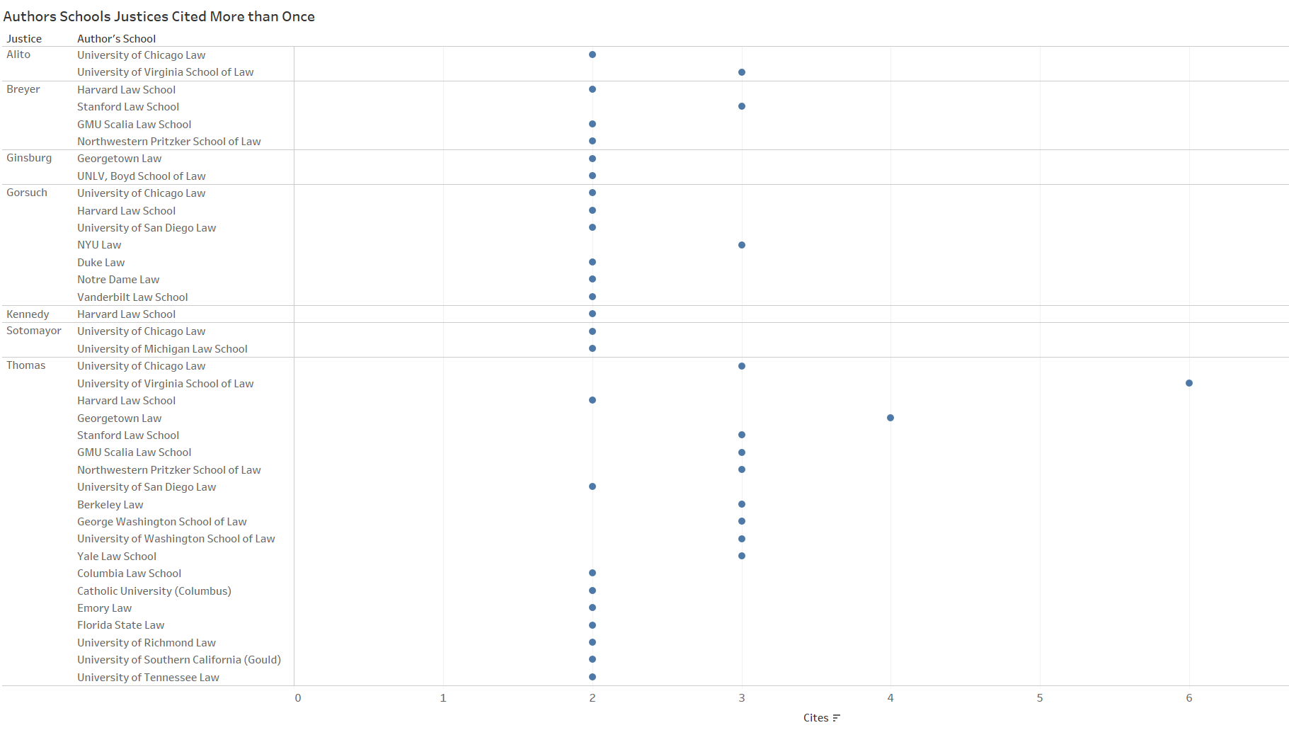 Professors at the University of Virginia were cited in the most observations with 13. Most of these cites were driven by UVA professors Caleb Nelson and Saikrishna Bangalore Prakash, who was cited in four observations (twice by Thomas and twice by Alito). The justices cited an assortment of Harvard Law professors, who accumulated 12 opinion-cites, with only one professor, Adrian Vermeule, cited in more than one observation. Following Harvard Law, University of Chicago Law’s faculty tallied 11 opinion cites, while faculty from Georgetown Law, Stanford Law and Yale Law each accumulated nine opinion-cites.