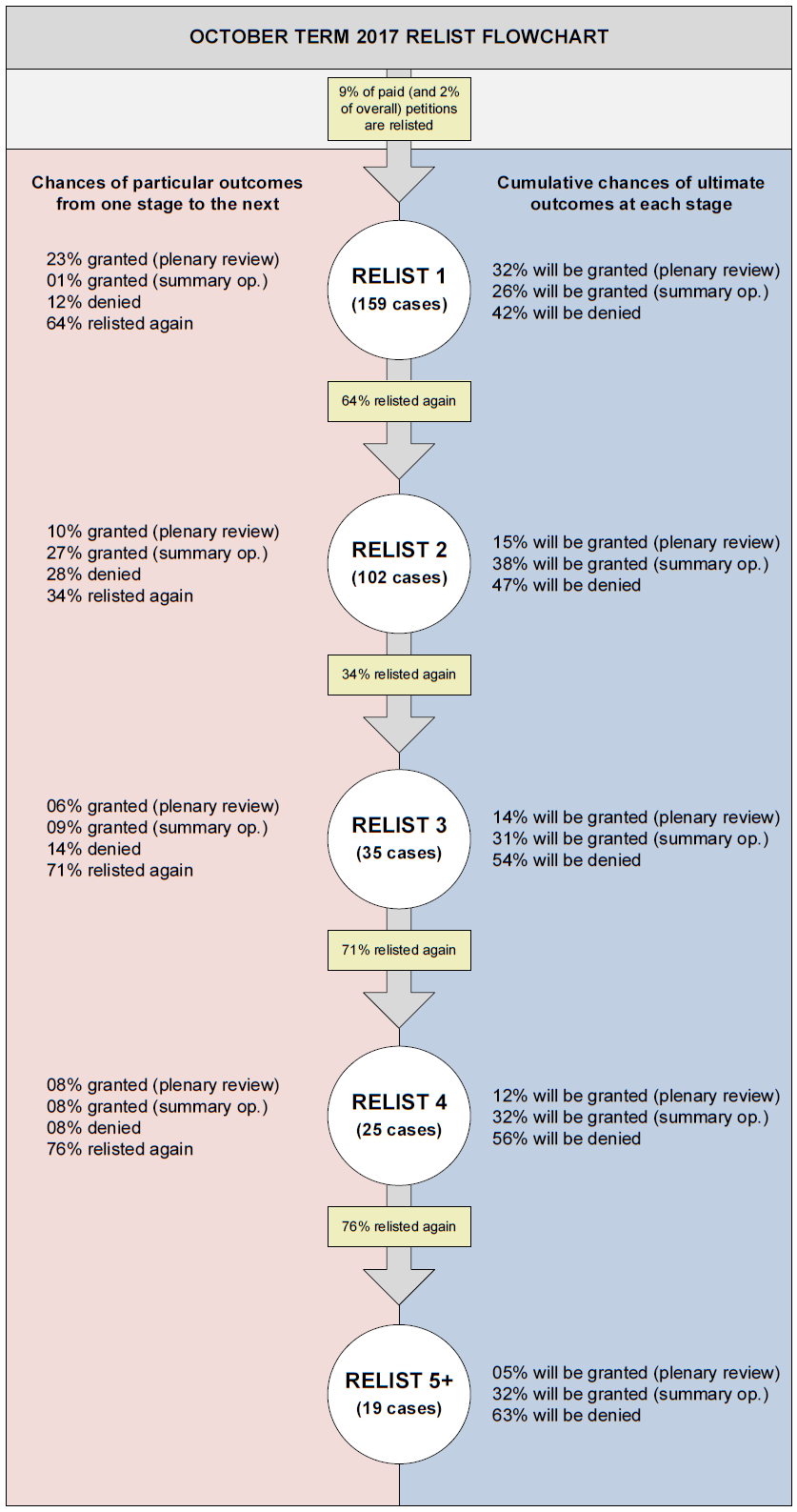For four years running, we have pored over the prior term’s relists to give the readers of this blog a clearer idea of just what a relist means. When we began with this mind-numbing task after October Term 2014, a first relist meant that the ultimate odds of a grant were better than 50/50 — not bad when the average chance of a grant hovers around three percent. Being relisted continued to serve as a harbinger during the 2017 term, often signaling when the Supreme Court was interested enough in a petition to seriously consider granting it. But for all that relists still told court-watchers last term, the noise-to-signal ratio increased noticeably compared with previous terms. The increased noise appears to result from three related shifts in the court’s relist practice: