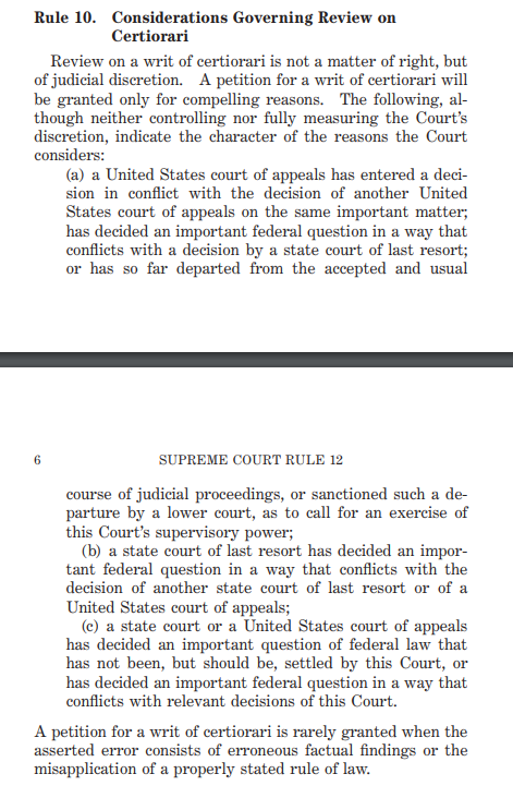 Another area of difference that was well within the purview of petitioning attorneys was in the text of the petitions themselves. Lawyers, however, have very little information from the court on what the justices are looking for when reviewing petitions. The entirety of the court’s contribution to this subject is in Supreme Court Rule 10, which describes the various types “compelling reasons” for cert grants.