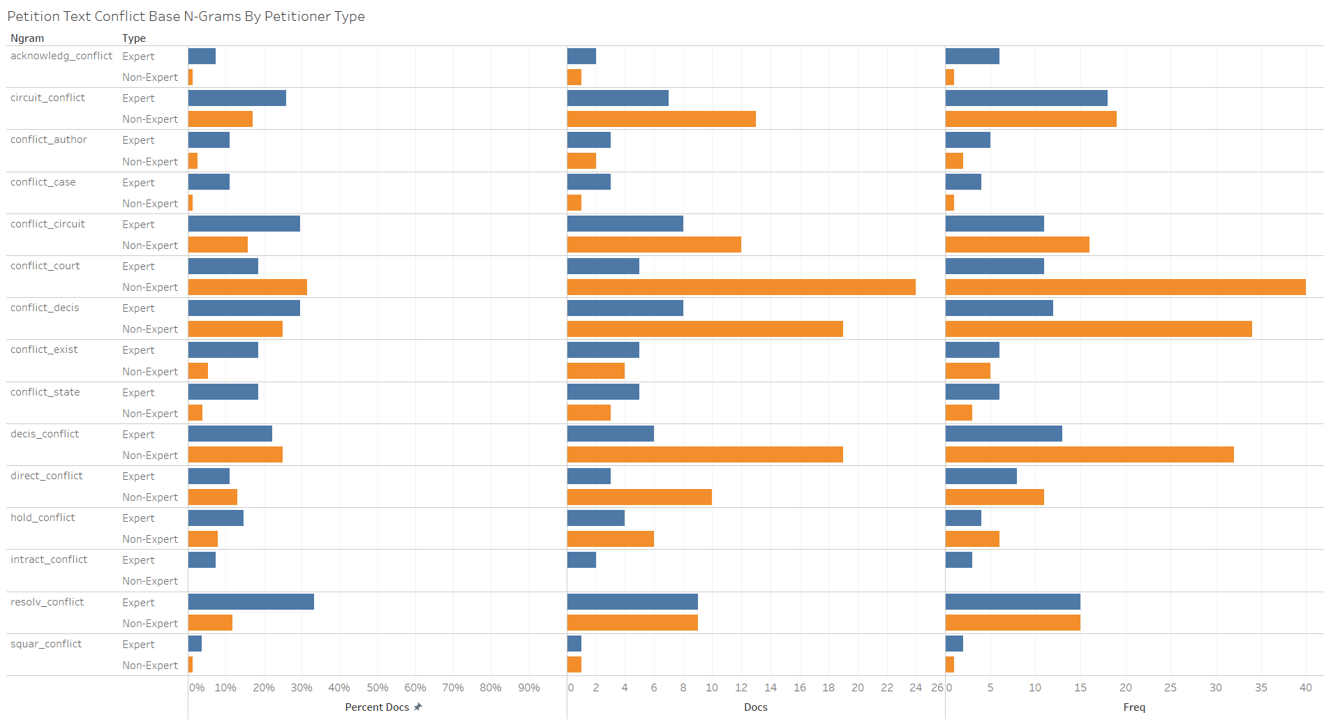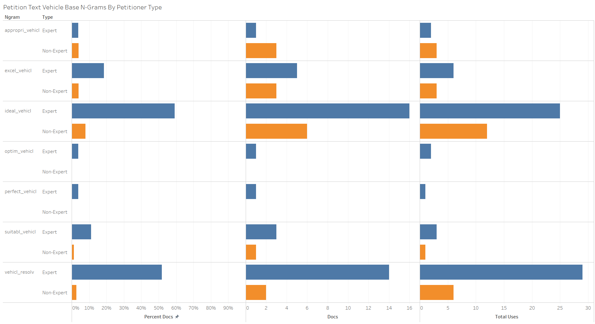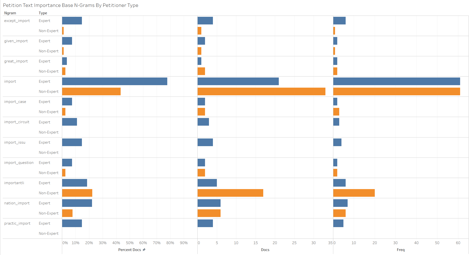 Digging into particular n-gram usage exposes greater differences between the two sets of petitions. Each n-gram analysis includes three graphs comparing the n-grams used in the text of experts’ and non-experts’ petitions. The first graph looks at the percentage of documents in which a given n-gram appears in each set. The second looks at the overall document count in which the n-gram appears in each set. The third looks at the count of times the n-gram appears in either set, which may include multiple times within the same petitions.