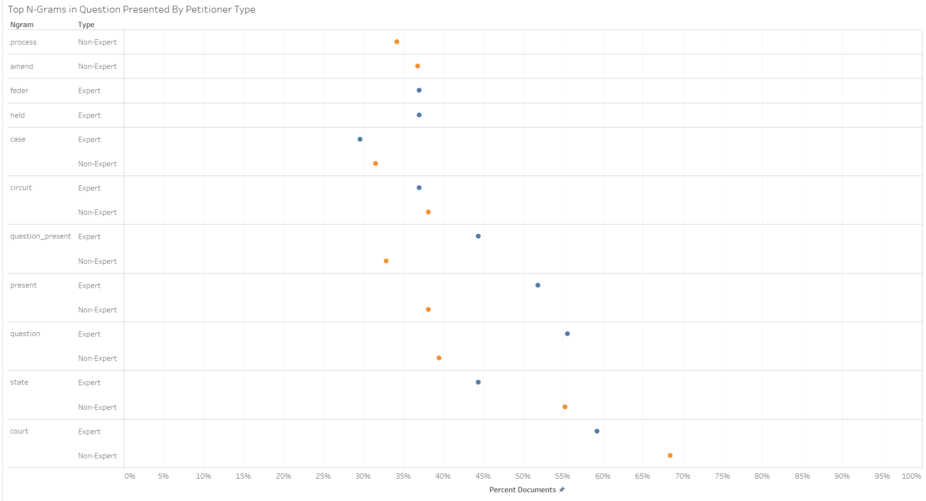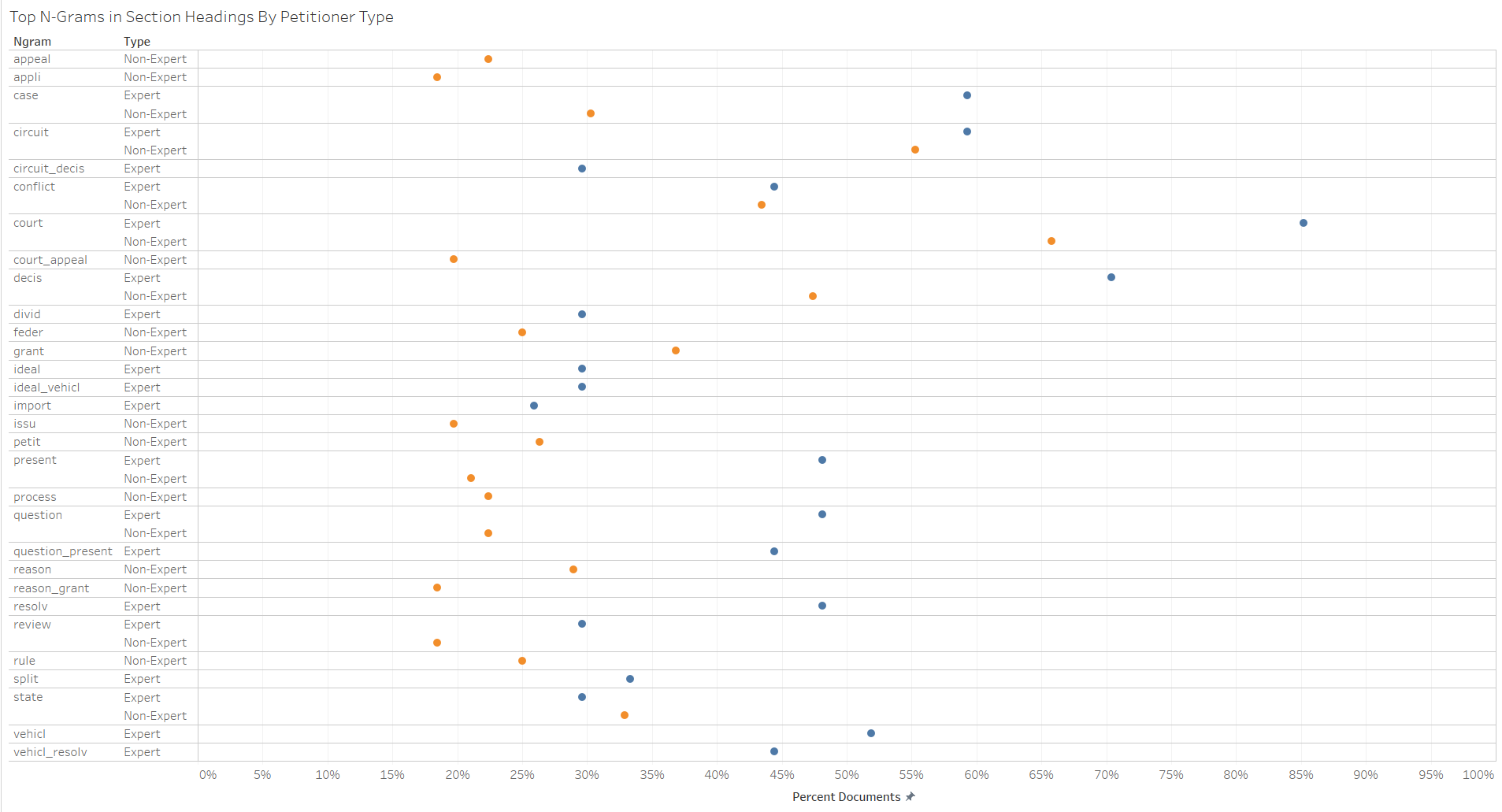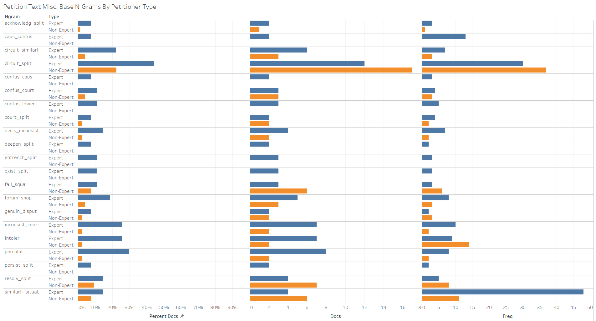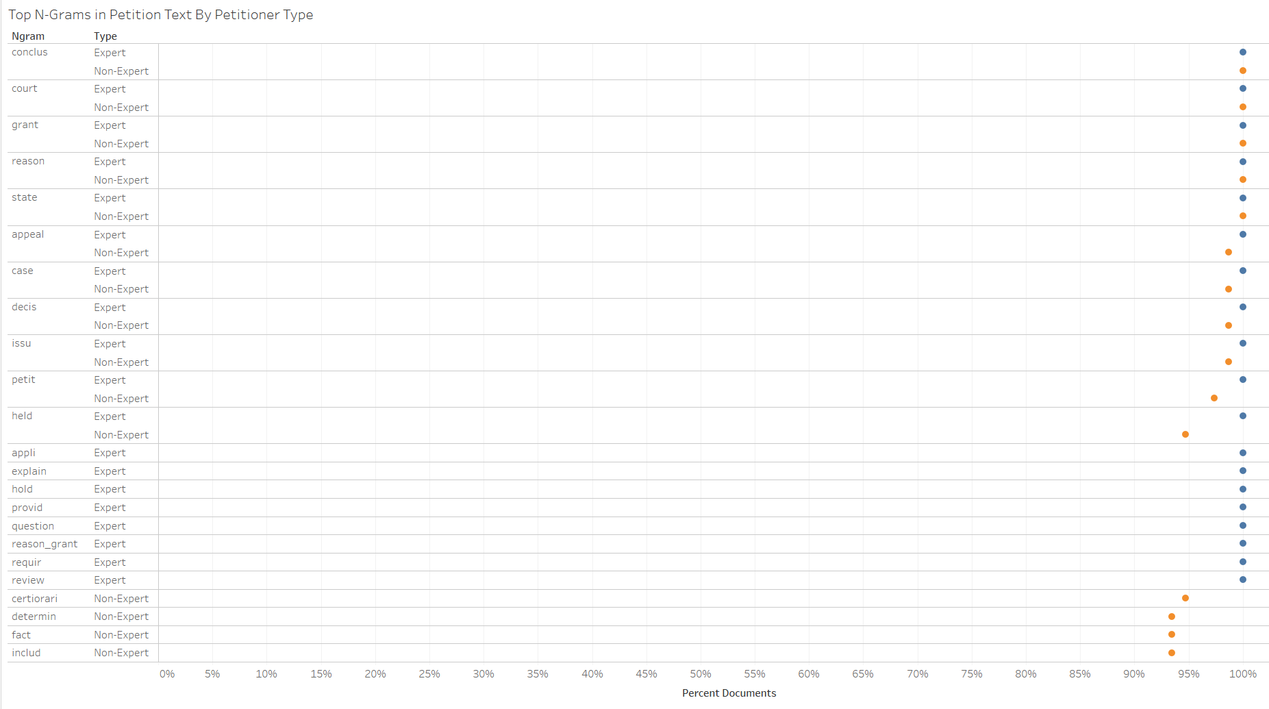 Experts appeared much more cognizant of the importance of a good vehicle for the court, as multiple n-grams including “vehic” appear in experts’ petitions in higher frequency and several were not used by non-experts at all.