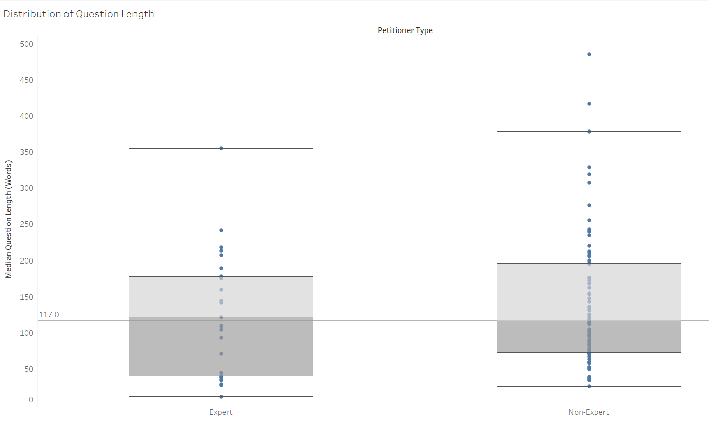 A simple area to observe for differences is the length of each of these petition components. The box-plot distribution graphs show the median word length in the middle of each box between the two shades of gray, with the distributions extending outwards. Each blue dot represents the length of an individual petition and dots outside of the lines reflect outliers that are far from the median. The combined median of the experts’ and non-experts’ length is depicted with the gray line running across the graph.