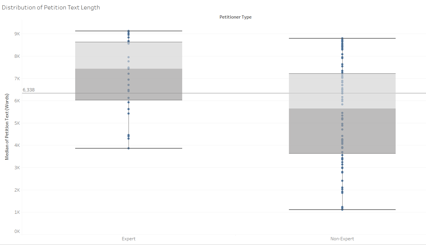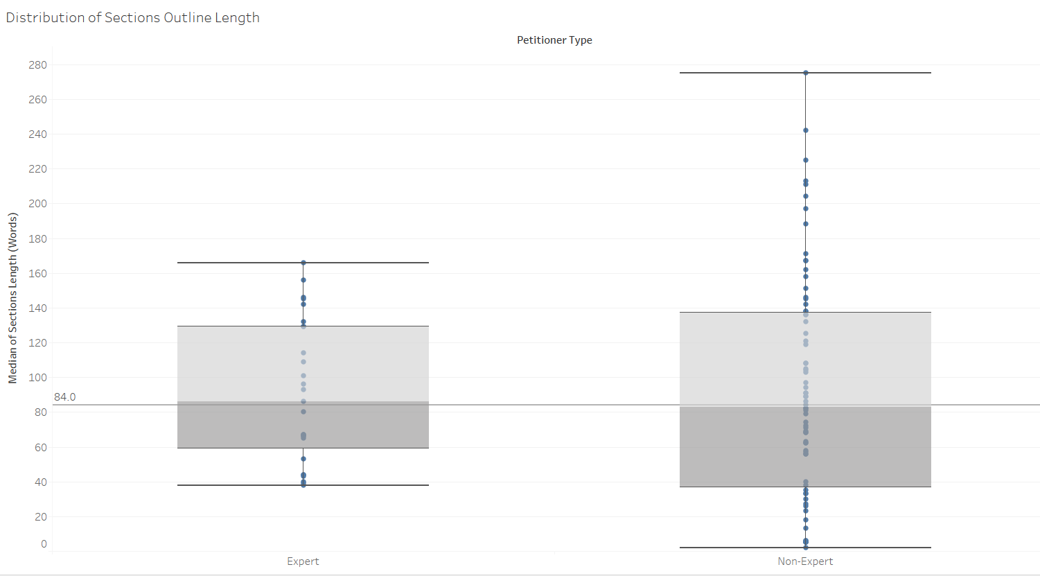 The experts’ section headings were somewhat densely packed between 40 and 170 words. Although the median length for non-experts was similar to that for experts, their spreads were quite divergent. Several non-experts’ petitions lacked section headings, which can be quite harmful to the chances of a petition’s success. A handful of others exceeded the 170-word-length upper limit for experts’ headings, with several well over 200 words.