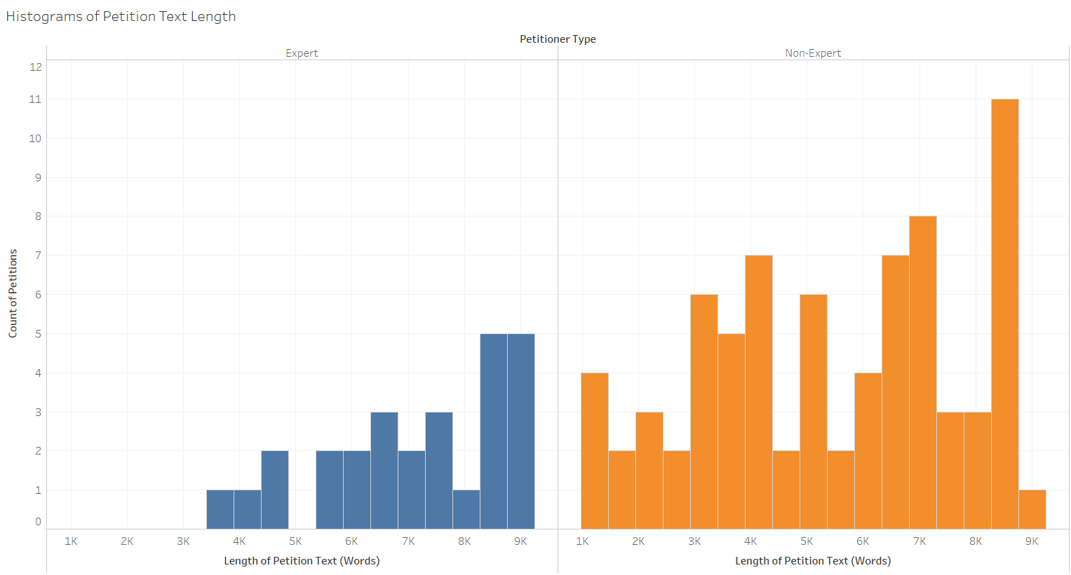 As with the section headings, spread of the non-experts’ petition text was much greater than that for the experts. The experts’ median was almost 2,000 words greater than the non-experts’, at close to 7,500 words compared to approximately 5,500 for non-experts. All of the experts’ petition-text length was in the range of just under 4,000 words to nearly 9,000 words, but the lengths of many non-experts’ petitions were well under 4,000 words, with some approaching as few as 1,000 words. Such differences and especially the tightly packed nature of the experts’ petition lengths are emphasized in histograms that compare the two distributions (These figures count the number of petitions within buckets of 500 words.).